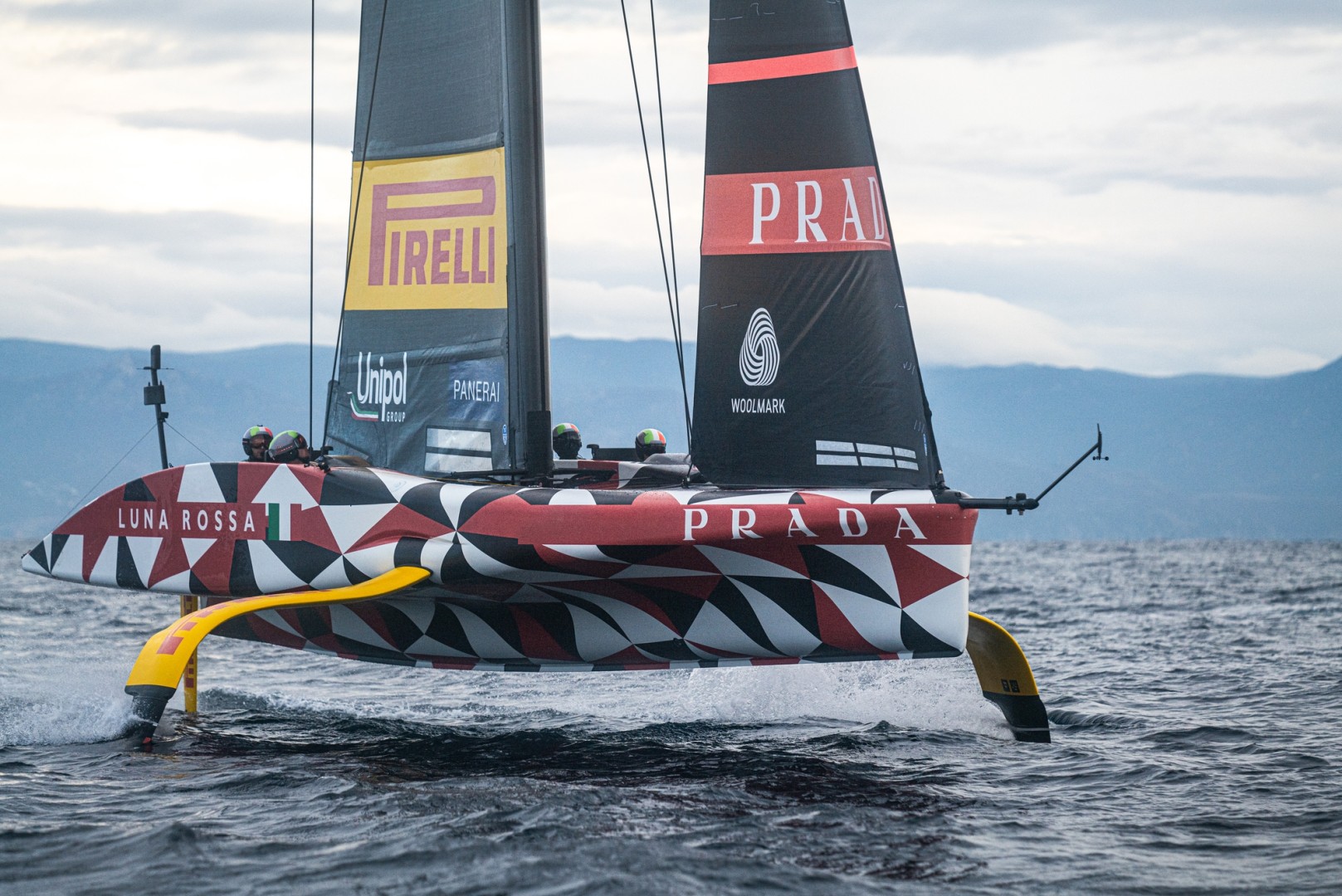 The new phase has begun and out on a pitch-perfect Sardinian morning in Cagliari, Luna Rossa Prada Pirelli were up and out early to catch the flatter water and a beautiful winter’s breeze of 7-12 knots. The near four-hour session though was punctuated by remarkable accuracy in flight with the trim team of Vittorio Bissaro, Andrea Tesei and Umberto Molineris just so assured, capable seemingly of any mode at any time in their LEQ12 that has been such a superb test platform over the past year.