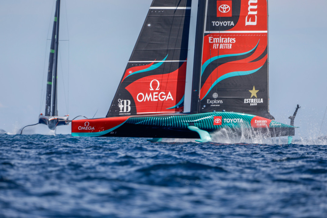 After two days of thunderstorms in Barcelona, the scheduled reserve day on Thursday was used by the Race Committee to catch up, with five races run in total. Two races for Emirates Team New Zealand against INEOS Britannia and Orient Express Racing Team, both resulting in wins to Emirates Team New Zealand.
