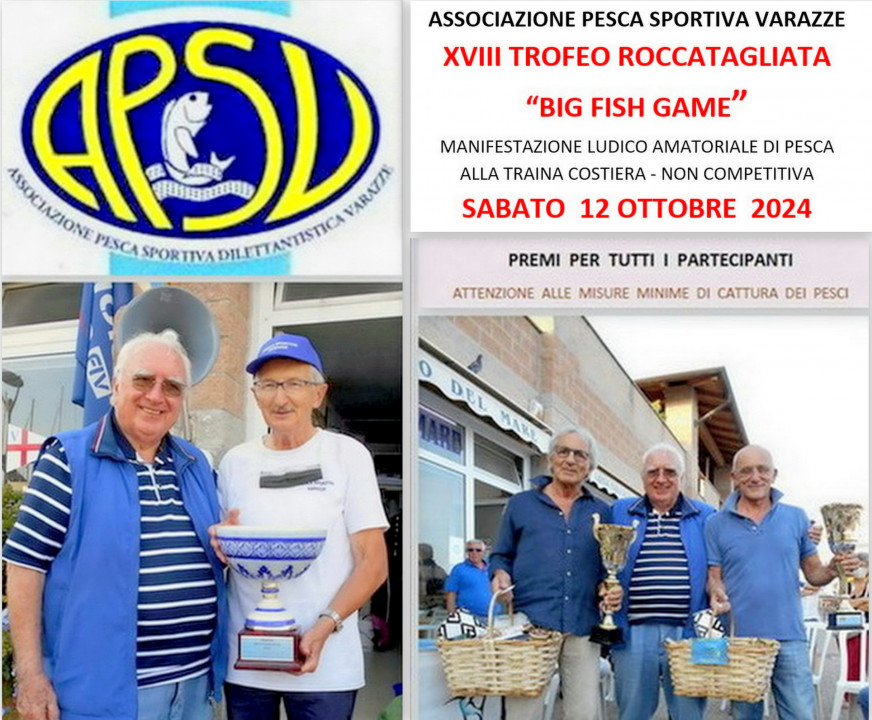 Sabato 12 ottobre 2024, a chiusura della stagione di incontri e raduni di pesca, a Varazze si terrà la diciottesima edizione del "Trofeo Roccatagliata - Big Fish Game": classica manifestazione ludico amatoriale di traina costiera non competitiva, organizzata dall’Associazione Pesca Sportiva Dilettantistica Varazze, con particolare attenzione alla promozione e sensibilizzazione dei partecipanti e di quanti a vario titolo coinvolti, al mantenimento della Biodiversità Marina e alla conservazione dell’Ambiente