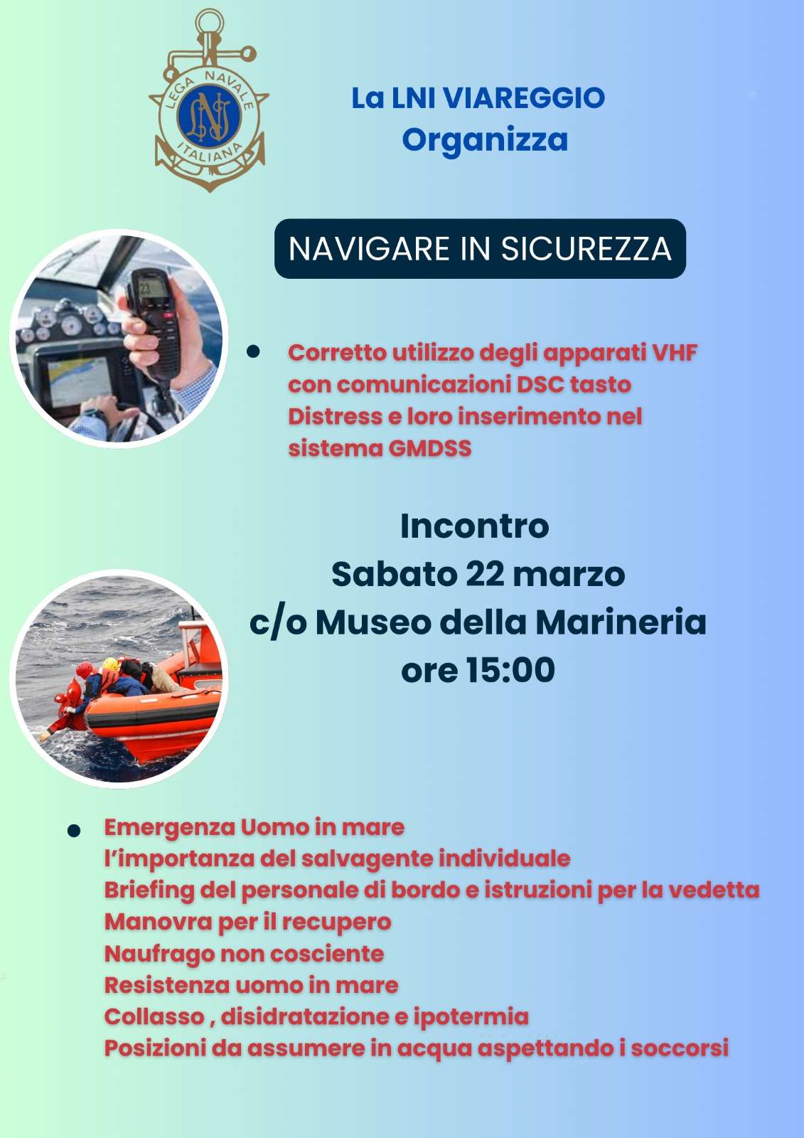 Ancora una volta la LNI viareggina punta l’attenzione su un tema di grande attualità: "Navigare in sicurezza”, infatti, sarà l'argomento dell’incontro che sarà un'importante occasione di formazione e sensibilizzazione per tutti coloro che operano o navigano in mare.