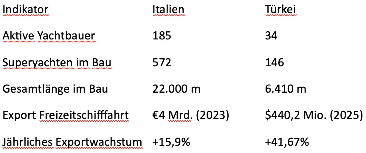 Der Exportwert der türkischen Freizeitschifffahrt erreichte 2025 insgesamt 440,2 Mio. USD, mit einem jährlichen Wachstum von +41,67%. Der Inlandsmarkt übertraf zwischen Januar und August 566 Mio. USD, wobei über 53% der Yachten länger als 24 Meter waren. Italien verzeichnete laut Confindustria Nautica im Jahr 2023 Exporte im Wert von 4 Mrd. EUR, ein Wachstum von +15,9%.