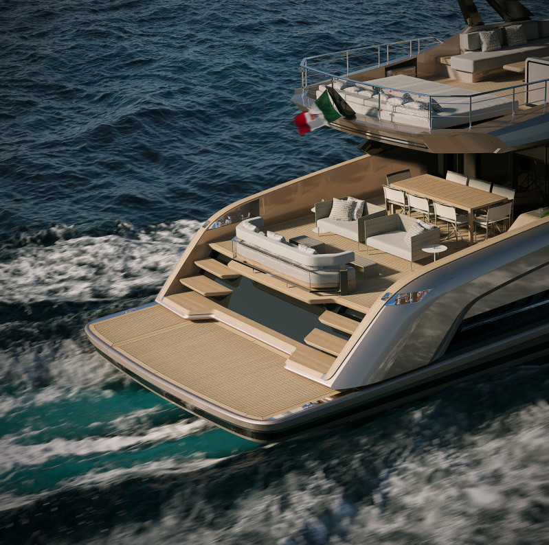 Die Heckgarage bietet Platz für ein 4-Meter-Waterjet-Tender, das längs untergebracht wird und dessen Handling mit der Beach-Plattform verbunden ist. Der Stauraum erlaubt zudem die Aufnahme verschiedener Water-Toys.