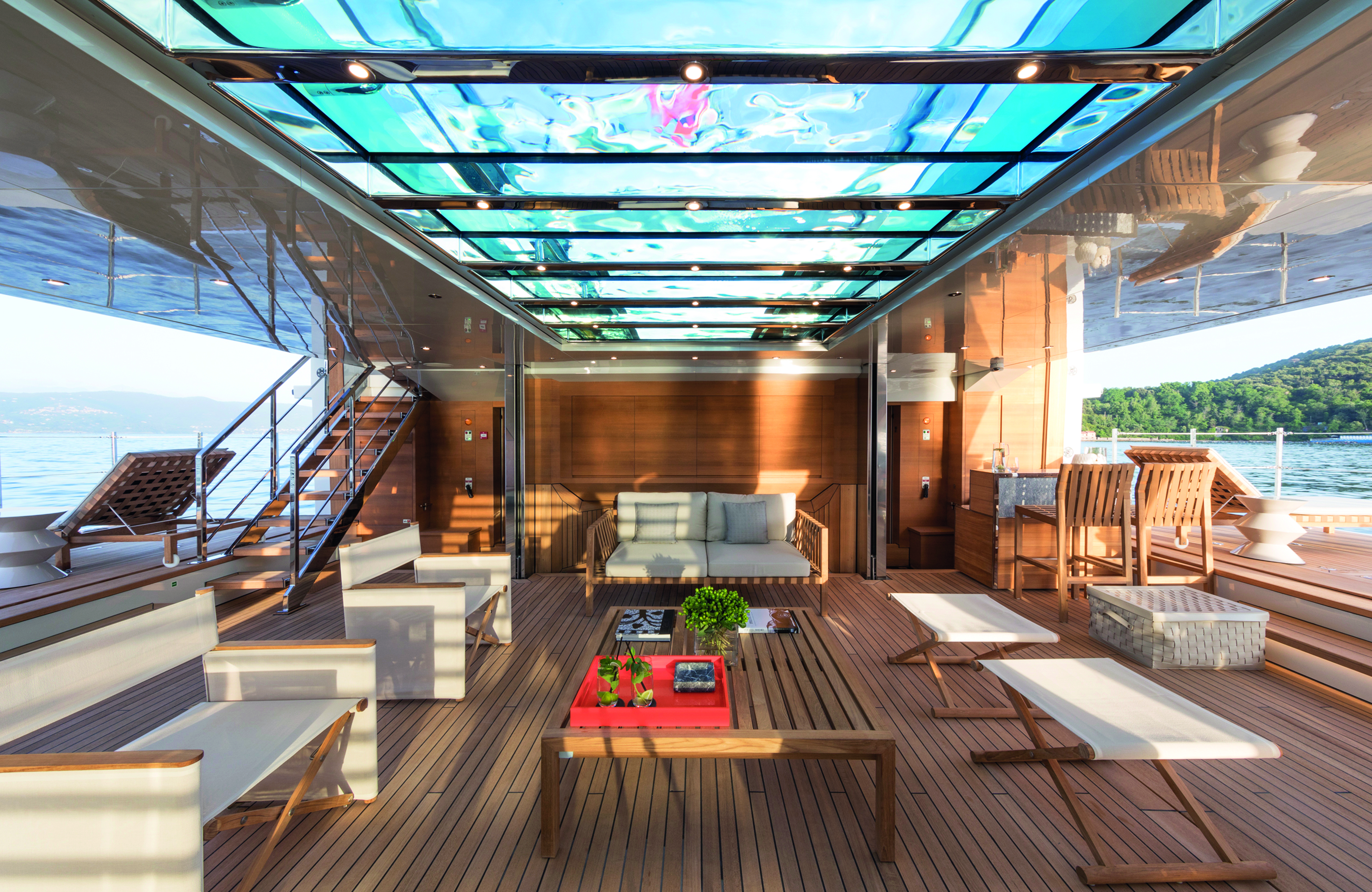 The experience gained on platforms exceeding 50 metres allowed the studio to explore solutions focused on space management and the relationship with the marine environment. These include fully open beach areas, stern configurations with multiple opening platforms, swimming pools integrated as architectural elements, and design solutions aimed at continuity between interior and exterior spaces.