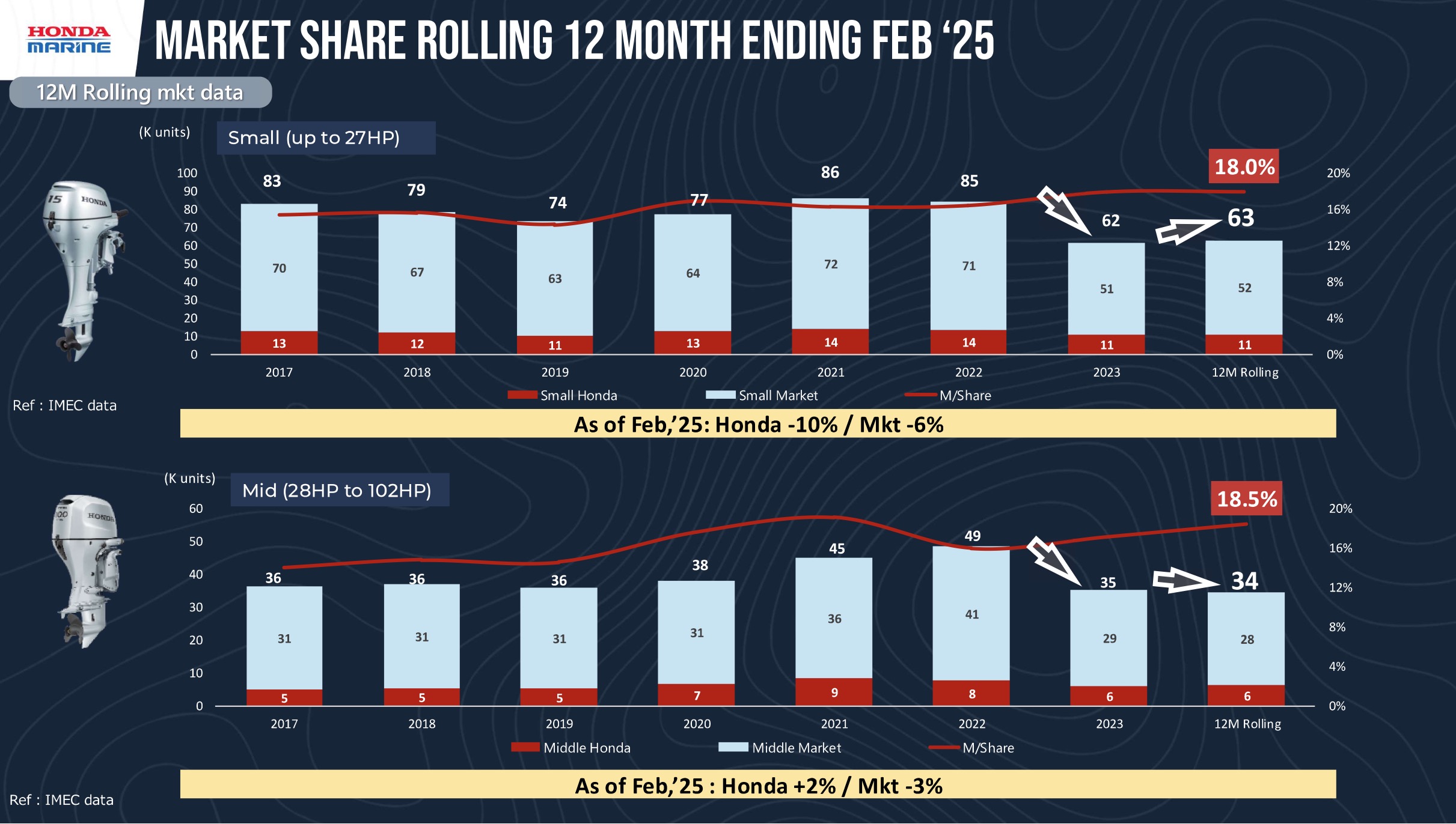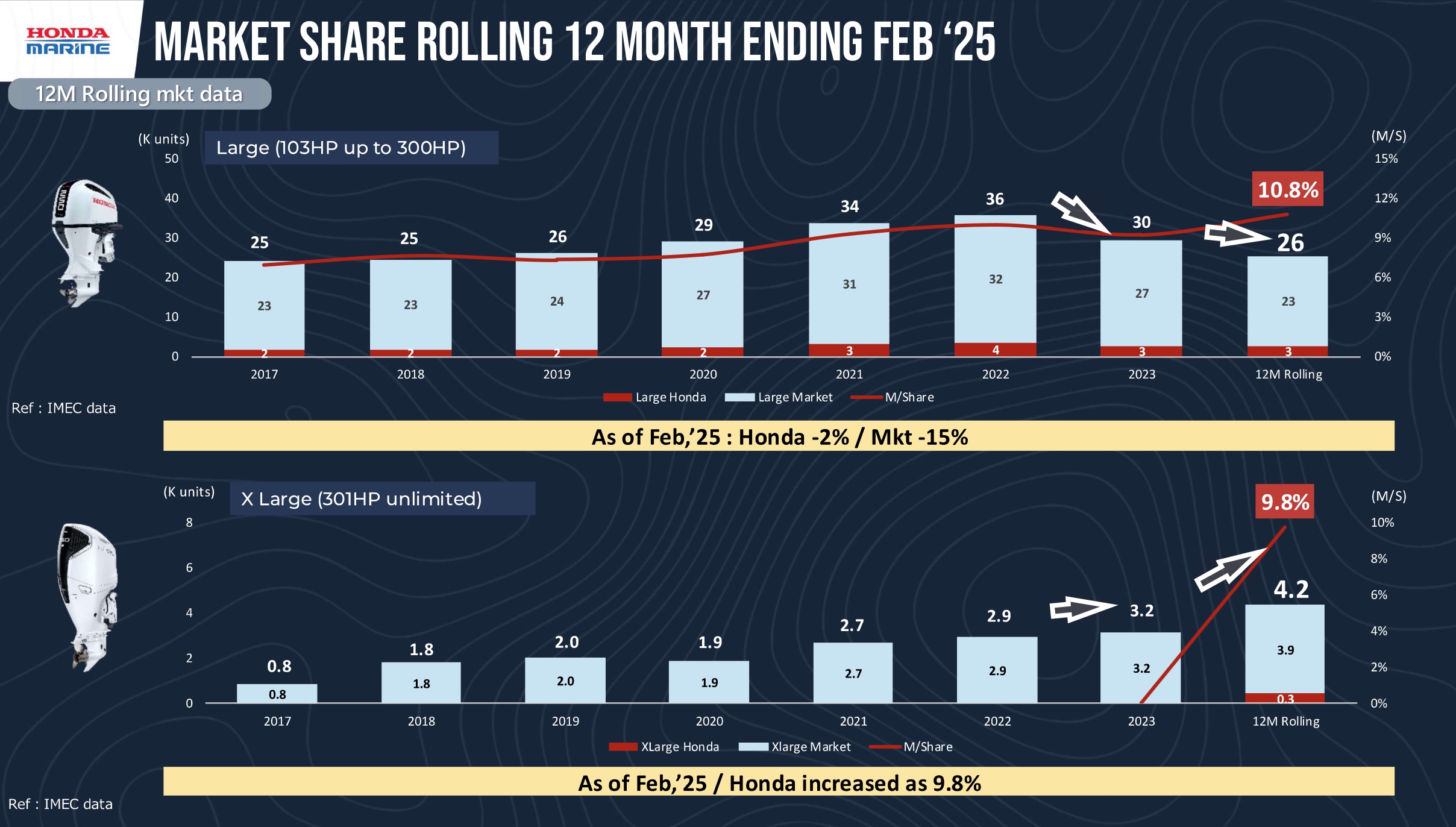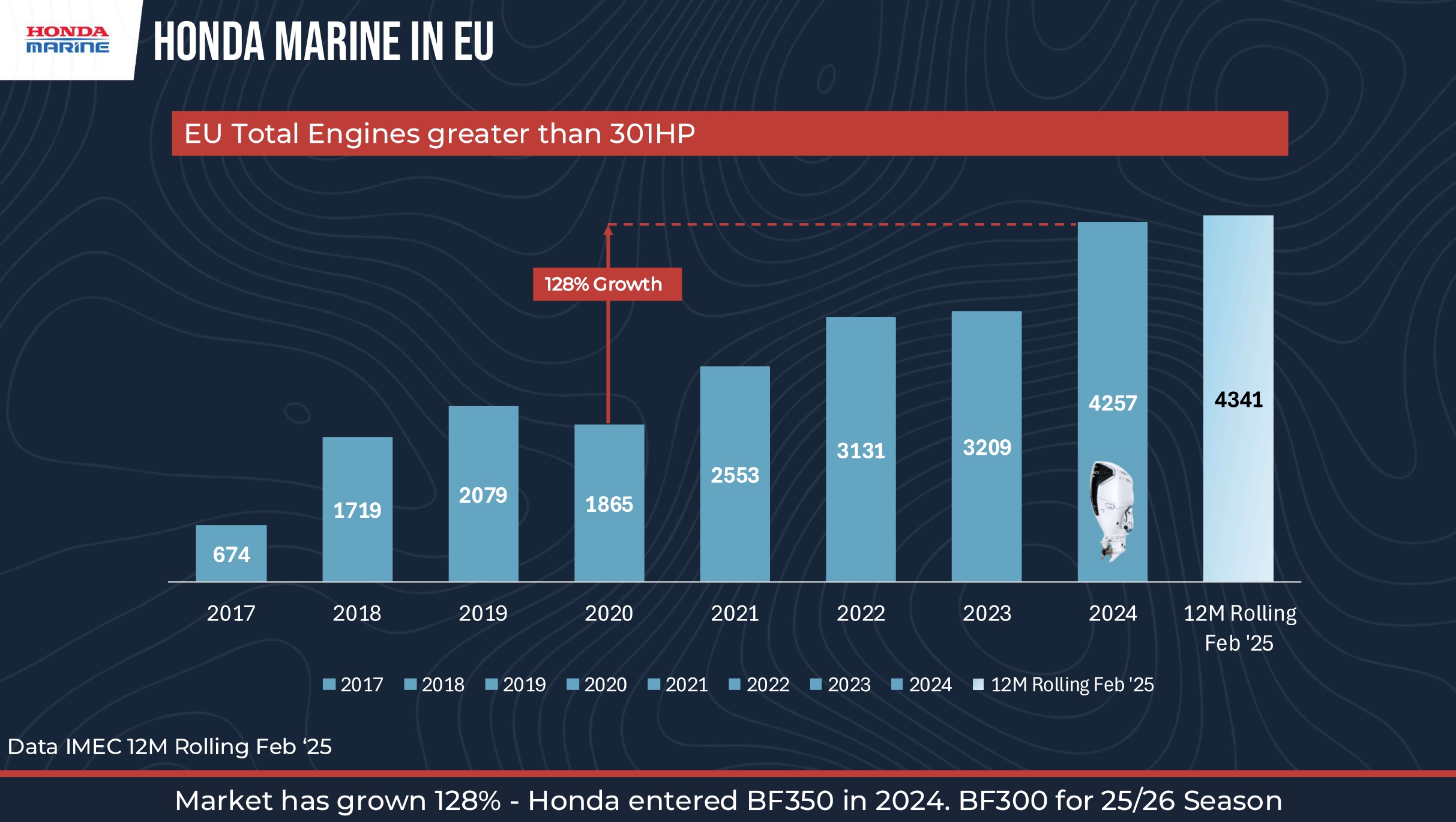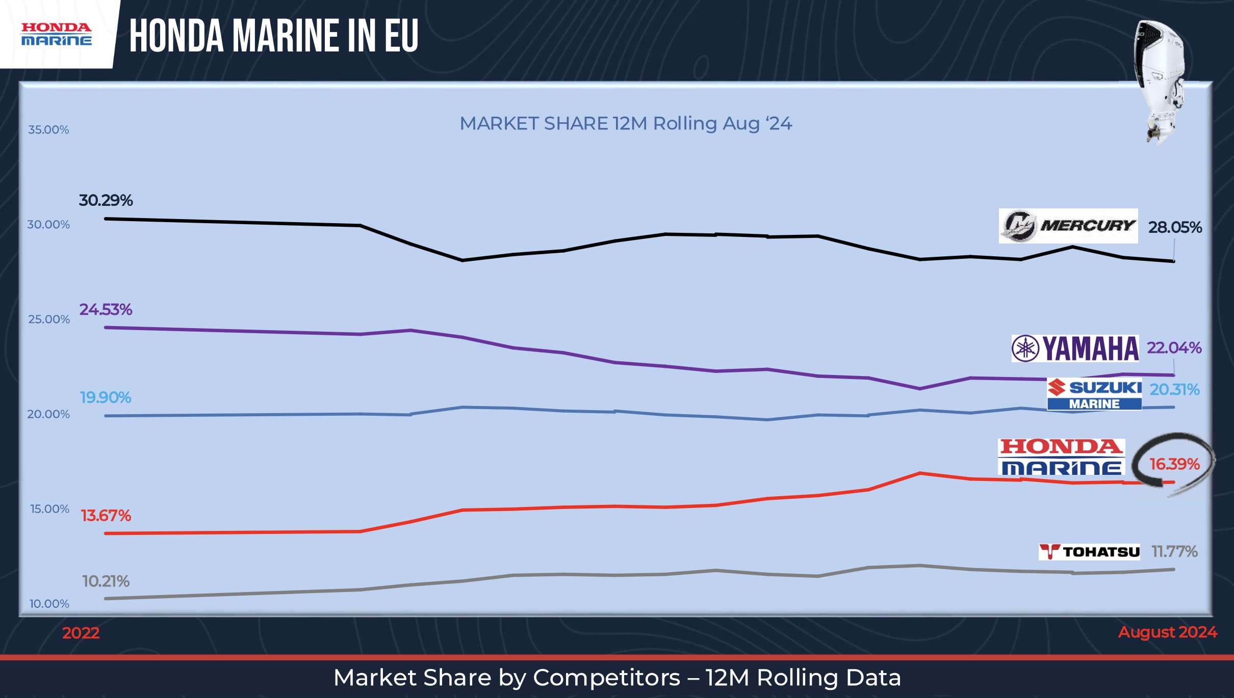 In the 350 HP outboard segment (August 2024 data): Mercury held 70%, Yamaha 12%, Suzuki 5%, and Honda already reached 13% – an impressive debut result.