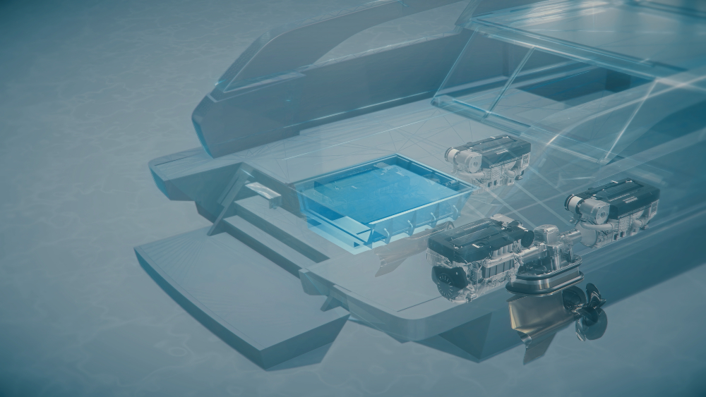 A key feature of the new propulsion platform is its dual engine configuration: each installed pod is paired with two 1,000 hp Volvo Penta D13 engines, managed by an intelligent system capable of modulating power according to the yacht’s operational profile. This approach enables optimised operation at low and medium loads, improving energy efficiency, noise comfort, and manoeuvrability – both in harbour and at sea.