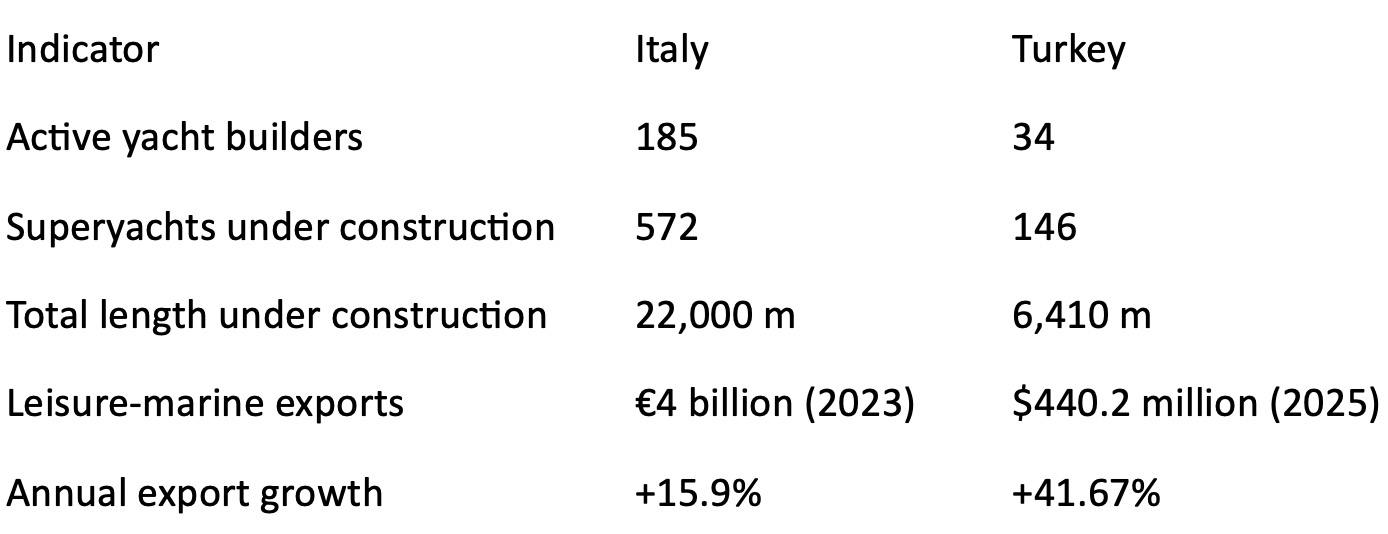 The export value of the Turkish leisure-marine sector reached USD 440.2 million in 2025, with an annual growth rate of +41.67%. Domestic sales from January to August exceeded USD 566 million, with more than 53% of yachts above 24 metres. Italy, according to Confindustria Nautica, recorded EUR 4 billion in exports in 2023, with +15.9% growth.