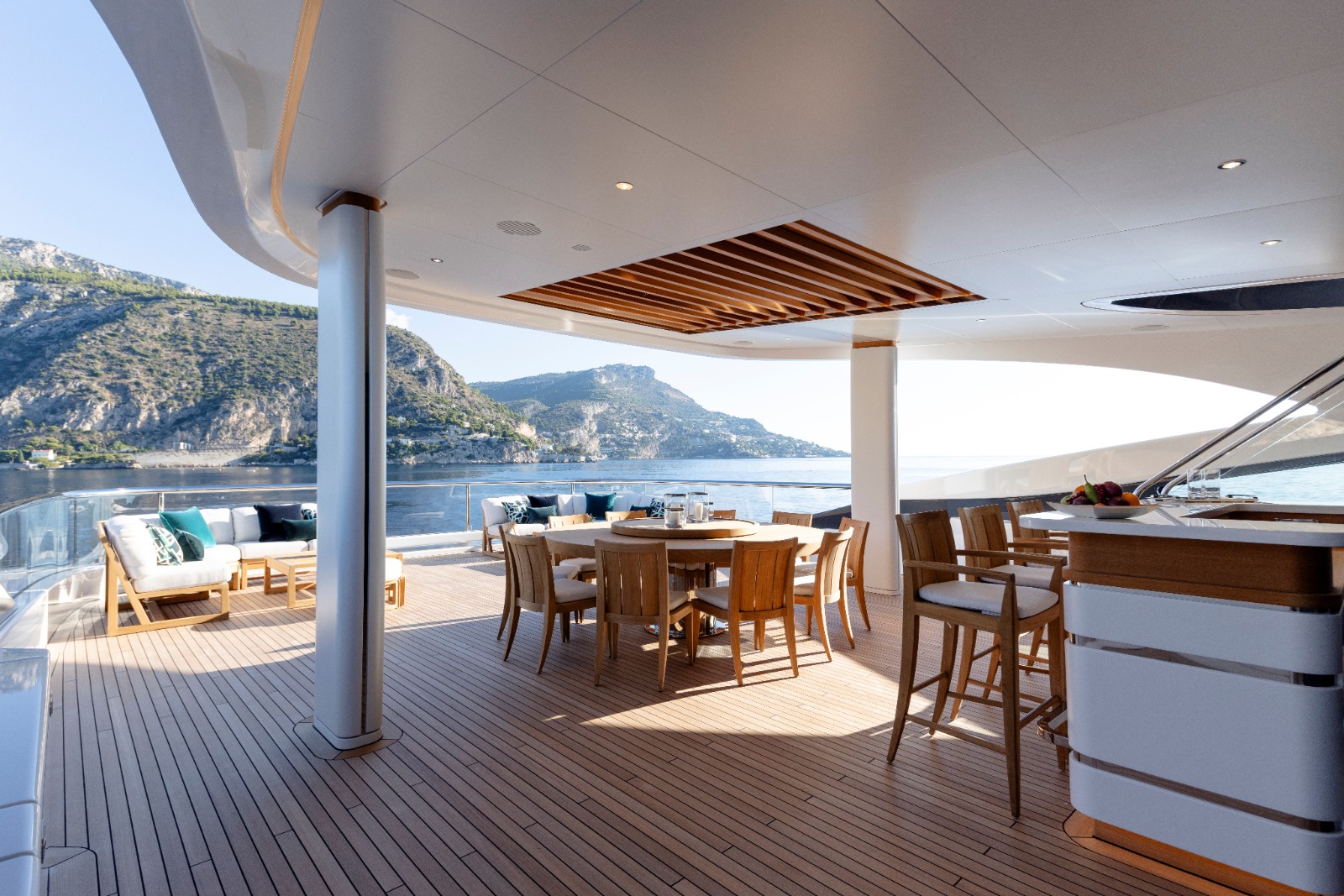 The Upper Deck is entirely dedicated to the owner, with a panoramic suite forward, private office, lounge, and alfresco dining area. The aft section of the upper deck, with its own lounge and dining table, is for the owner’s exclusive use and not connected to the Main Deck, ensuring maximum privacy.