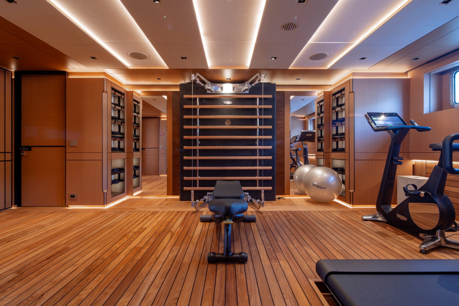 The Lower Deck hosts a wellness area complete with gym, spa, sauna, steam room, and massage space. The Main Salon, with its grand piano, opens onto the cockpit and Oasis Deck, creating a seamless flow between interiors and exteriors.