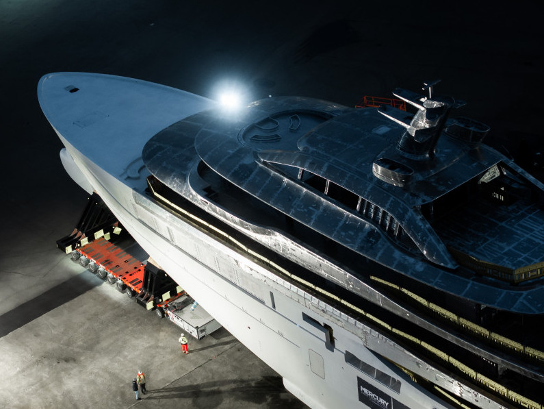 Project Y729, an 80-meter yacht developed by Oceanco, is being transported from its construction site in Zwijndrecht to the outfitting facilities in Alblasserdam. The yacht is scheduled for completion and delivery in 2027.