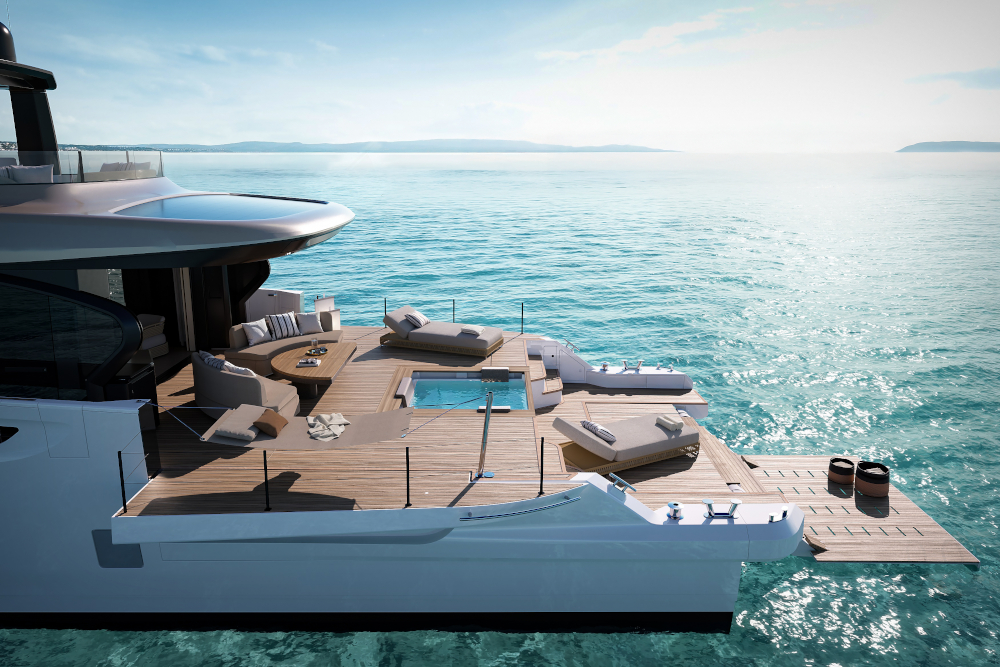 Side terraces and an aft platform integrated with the cockpit create a significantly larger outdoor area compared with yachts of similar length, enhancing outdoor living and the connection with the sea. This concept has had a noticeable impact on the market, and if one analyses the current offer, many builders are now moving in a similar direction.
