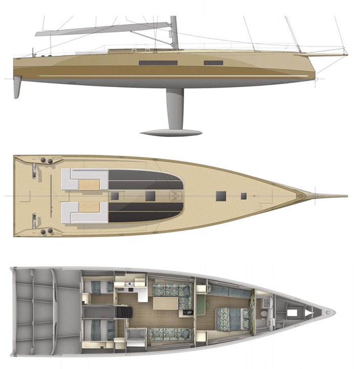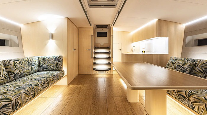The deck layout ensures that all sailing operations could be carried out from the aft steering and pit winches console, keeping the deck clean and safe. The cockpit is fitted with comfortable sofas and dining tables for cruising, which can be easily removed when preparing for racing.