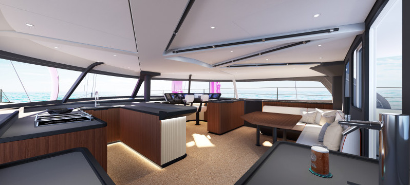This complexity meant that the interior layout couldn’t be finalised until the design geometry was fully resolved. Bulkheads, cabinetry, passageways – even window placements – were sculpted around the foil trunks. All details had to accommodate both the static structure and the dynamic movement of the foils without disrupting ergonomics. The owner’s passion for interior comfort drove us to go further: he envisioned a galley that was as much a performance workspace as it was a place for relaxation. It even features a beer tap - an offbeat touch that brings a bit of levity to serious offshore sailing.