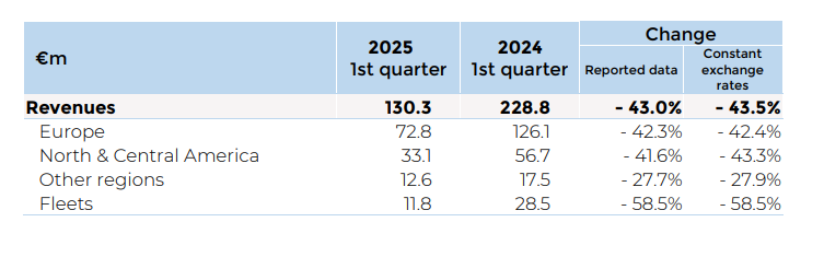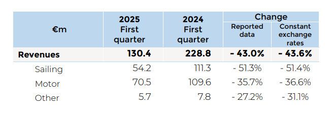 Revenues of €130m for Q1’25, down 43%, marked by the expected slowdown in demand across all boat markets, as well as the expected impacts of the network’s continued destocking (-€40m over the quarter) and the change of ERP