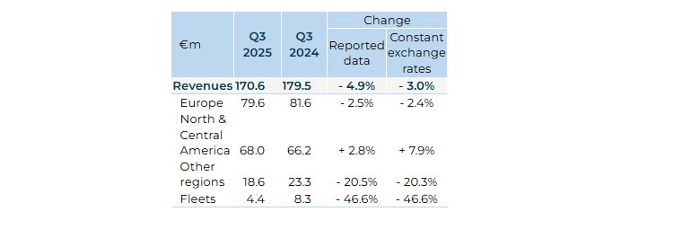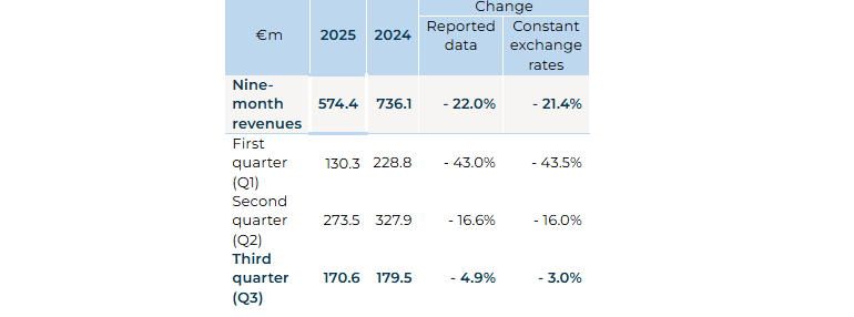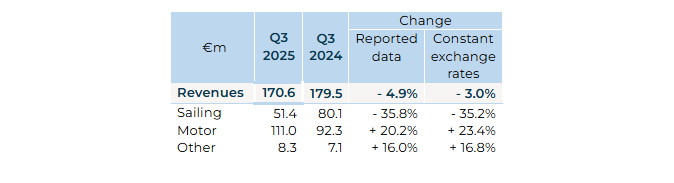 In the third quarter, the Group’s revenues came to €170.7m, down 3% at constant exchange rates. In a boat market still affected by an uncertain macroeconomic context, this performance confirms the turnaround in sales trends observed in the second quarter, with the overall levels of inventory stabilizing within the distribution networks since the end of the first half of the year (versus a reduction of over €30m in Q3 2024).