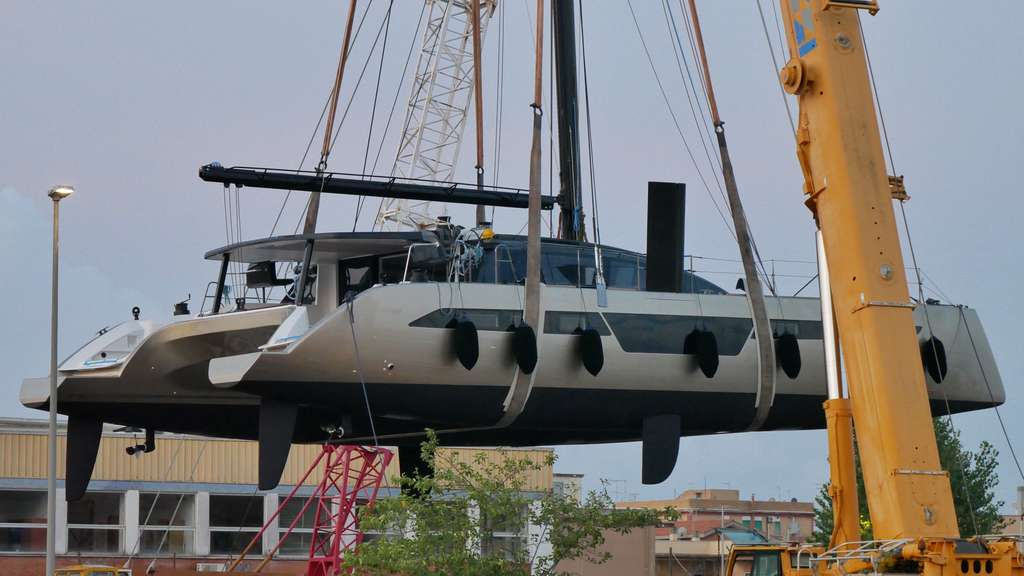 At 6:00 a.m. this morning, Comar Yachts launched its new flagship, the **C-Cat 65**. The 21-metre-long, 9.20-metre-wide maxi catamaran touched the water, lifted by a crane, fully revealing its lines: sleek, flowing, and gracefully rounded, designed to embody a multihull that is fast, inviting, and impeccably stylish. Its sand-gold hull did not go unnoticed, glowing ever brighter as the sun rose over the shipyard. “It is the result of the work of around fifty people, who dedicated some 40,000 hours over the past two years, along with more than 4,000 hours of project development shared between the Shipyard’s Technical Office, designer Enrico Contreas, the engineering firm Naval Design for structural and hydrodynamic studies, and Amadio & Partners Studio,” explained Massimo Guardigli of Comar Yachts.