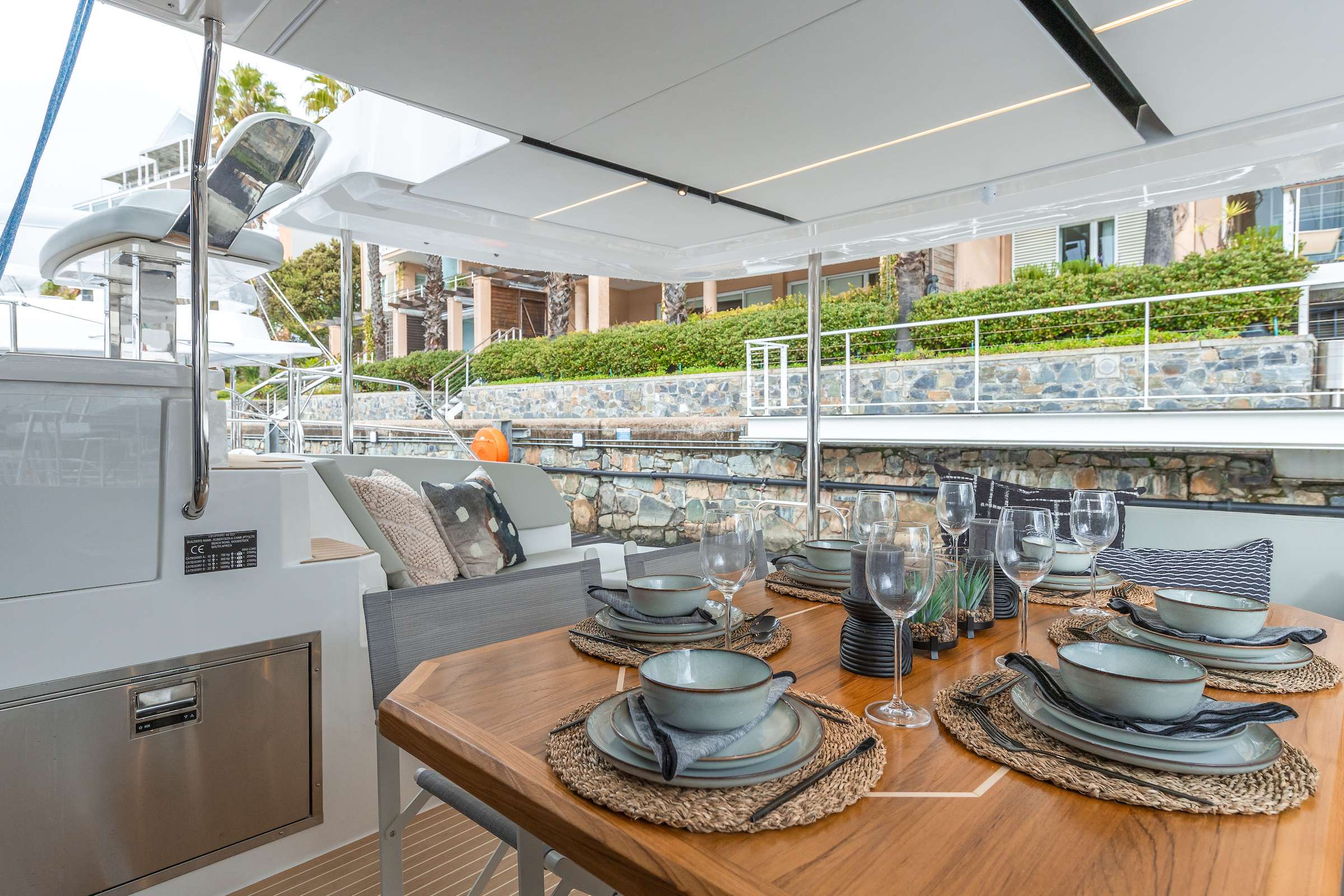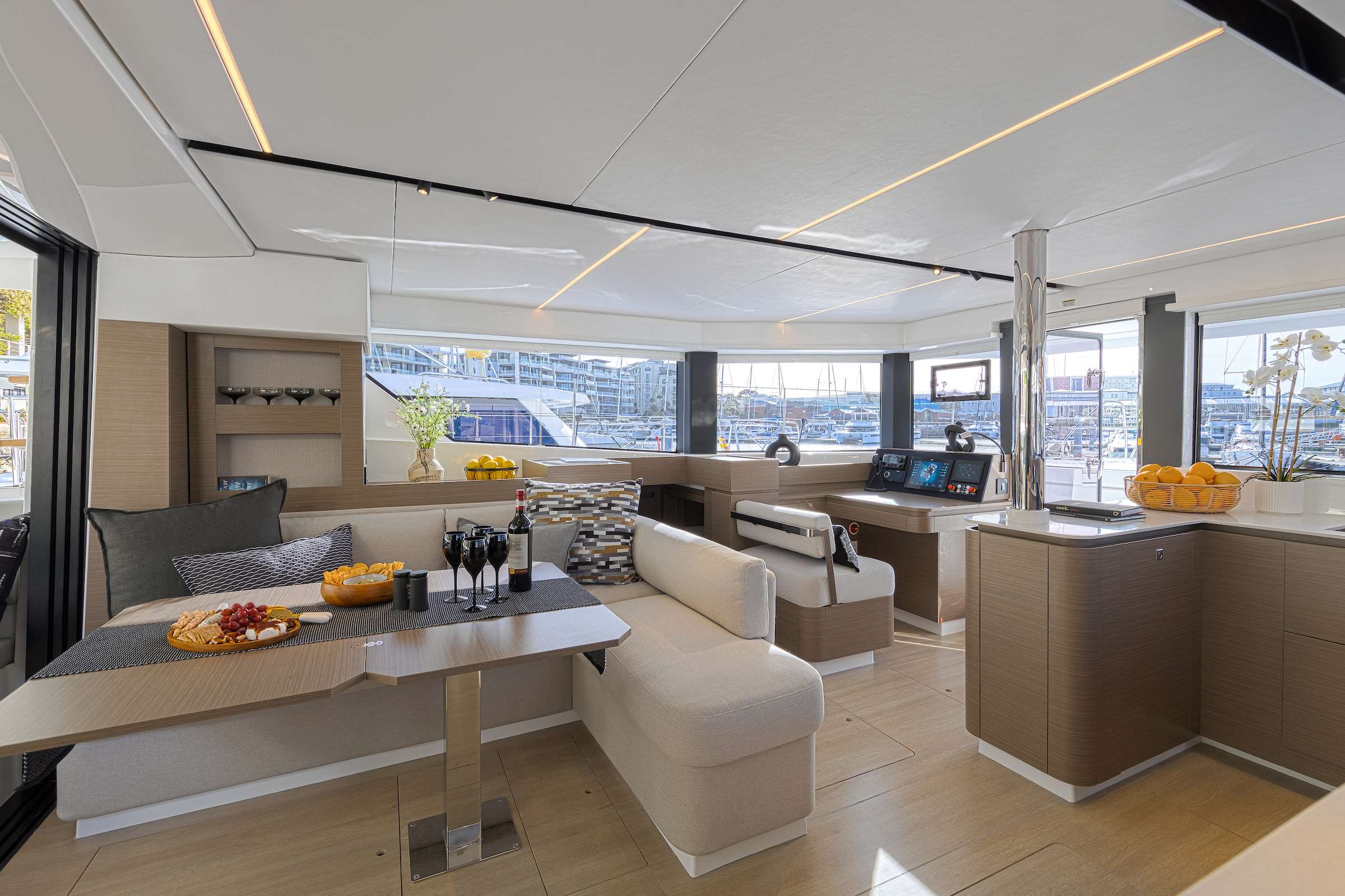 • Seamless integration of the aft cockpit and interior saloon with several choices of tables and furniture configuration inside and outside