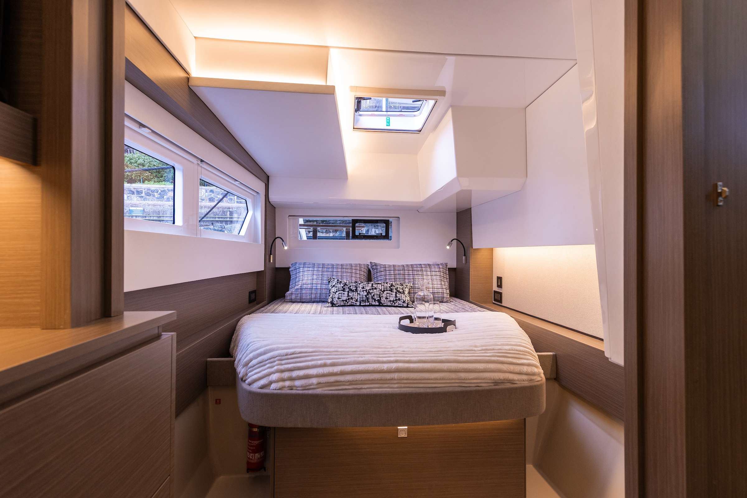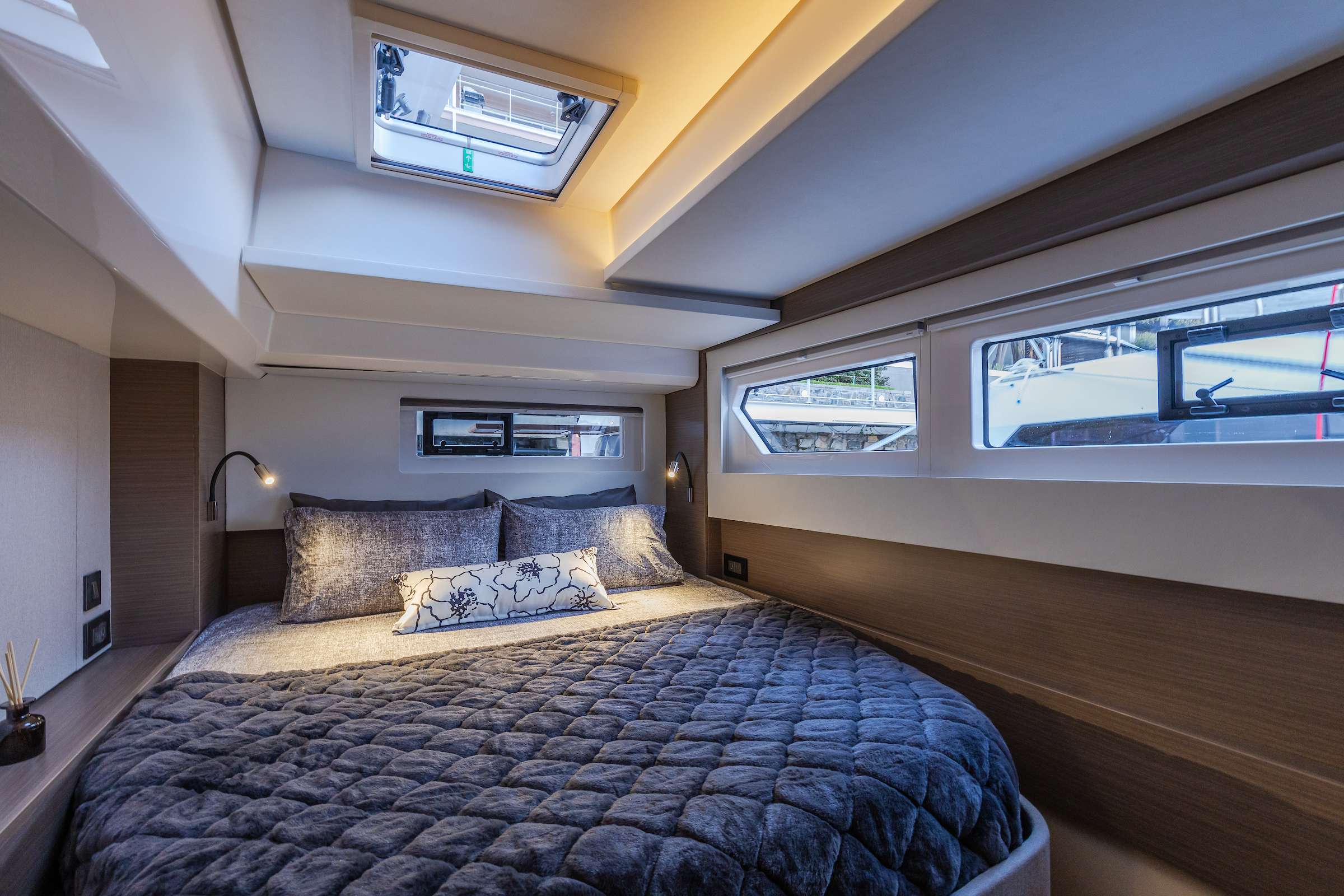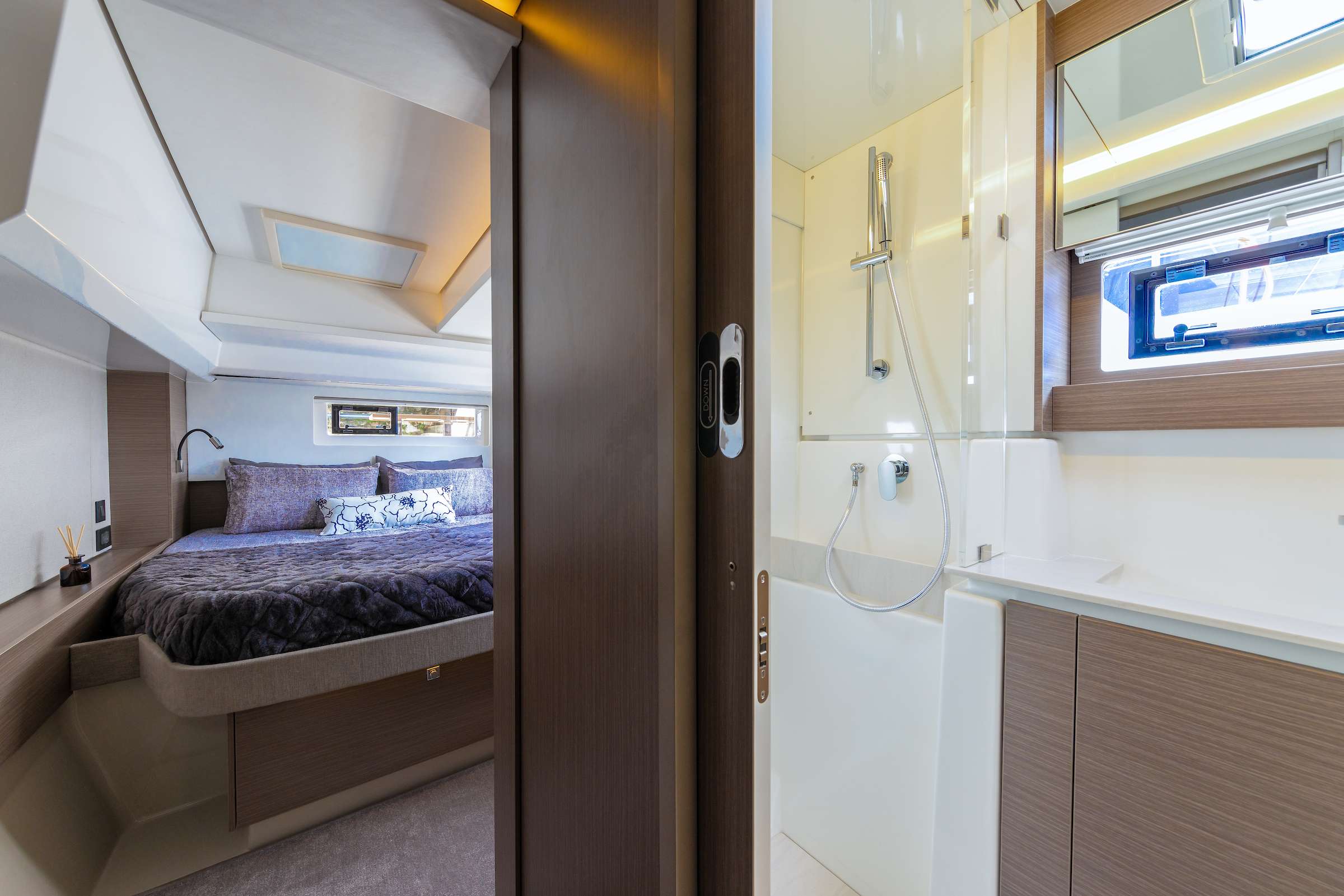 The Leopard 46 features a sleek, contemporary exterior design inspired by our power cat lineage. Its wraparound coach roof windows offer breathtaking panoramic views and flood the interior with natural light, enhancing the sense of space and openness. The innovative companionway sliding door, which fully retracts behind the helm station, effortlessly connects the saloon and aft cockpit, offering versatile spaces perfect for relaxation and entertainment. Unlike other designs, our solution maintains the full functionality and comfort of two distinct spaces, even when the door is closed.