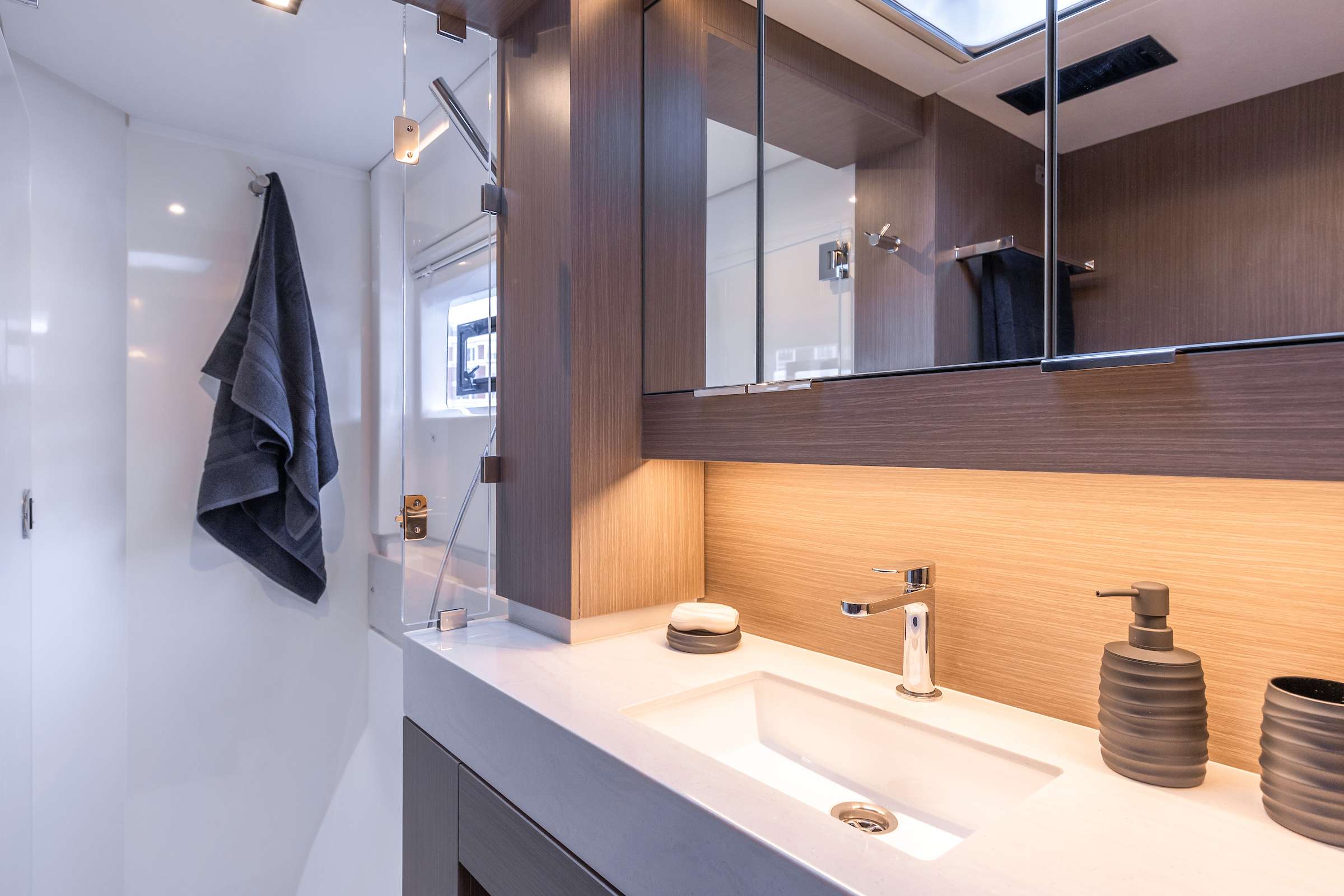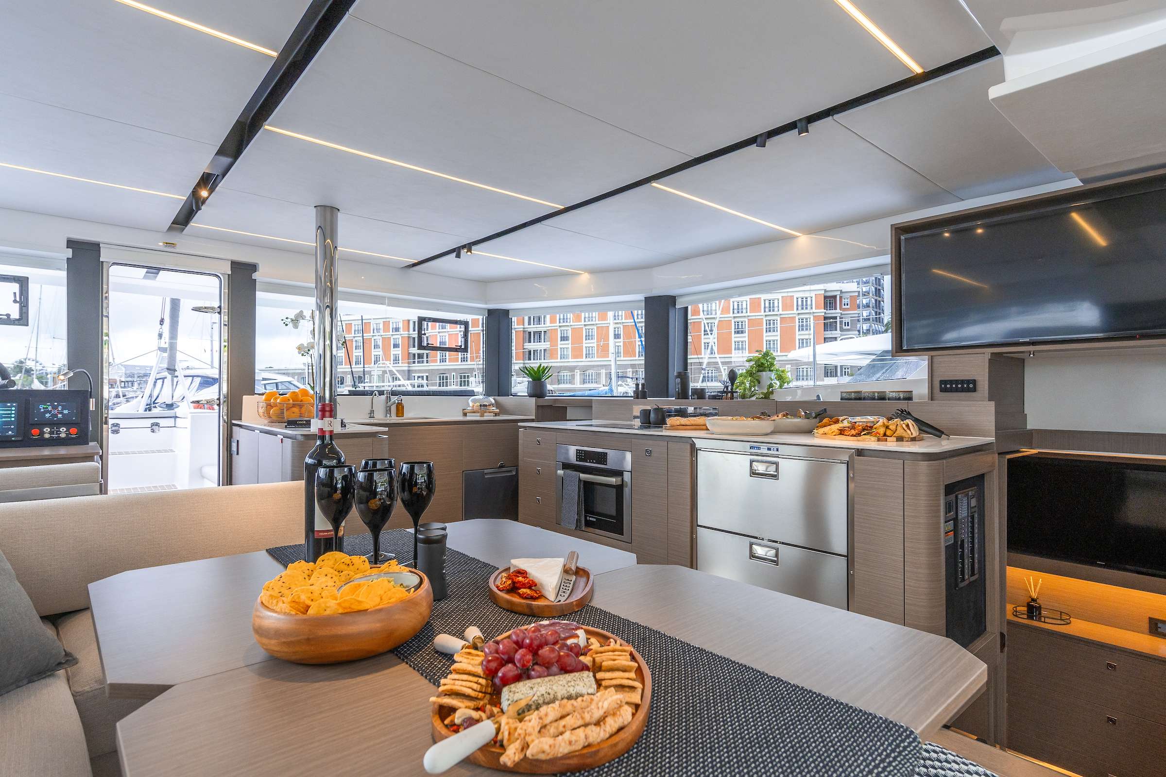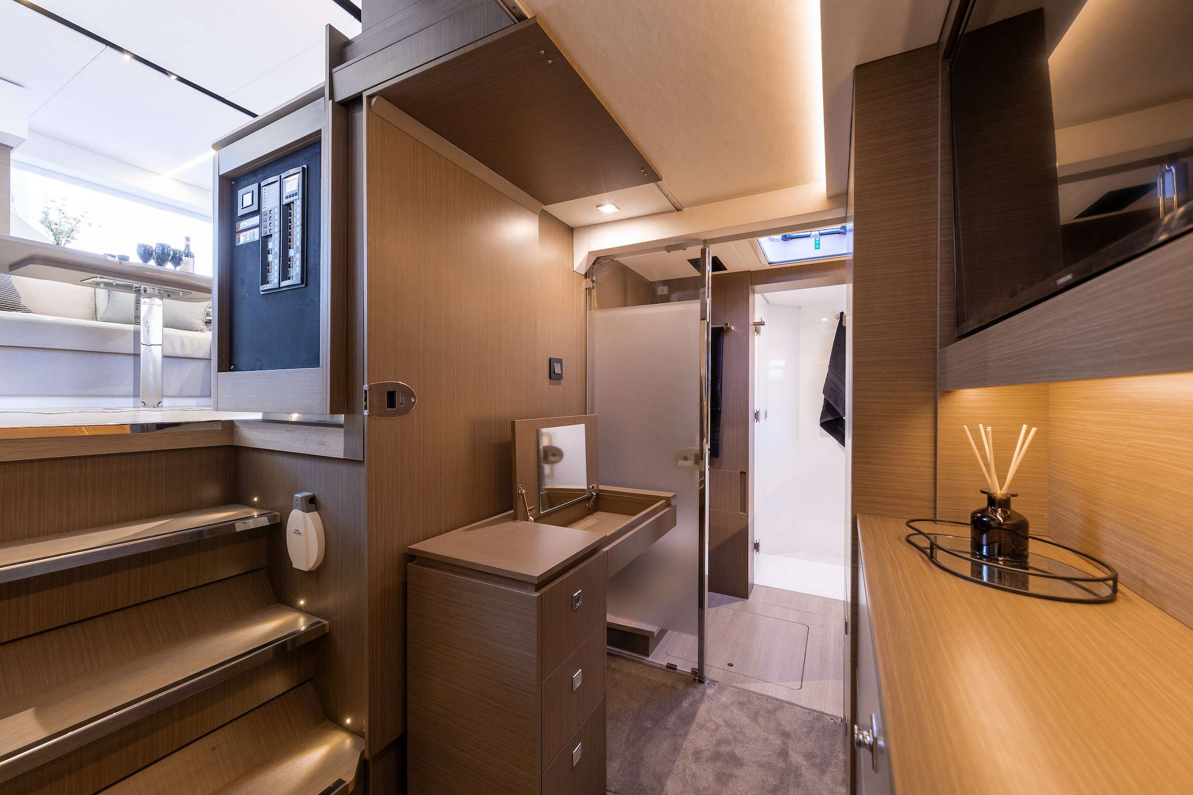 The Leopard 46 features a sleek, contemporary exterior design inspired by our power cat lineage. Its wraparound coach roof windows offer breathtaking panoramic views and flood the interior with natural light, enhancing the sense of space and openness. The innovative companionway sliding door, which fully retracts behind the helm station, effortlessly connects the saloon and aft cockpit, offering versatile spaces perfect for relaxation and entertainment. Unlike other designs, our solution maintains the full functionality and comfort of two distinct spaces, even when the door is closed.