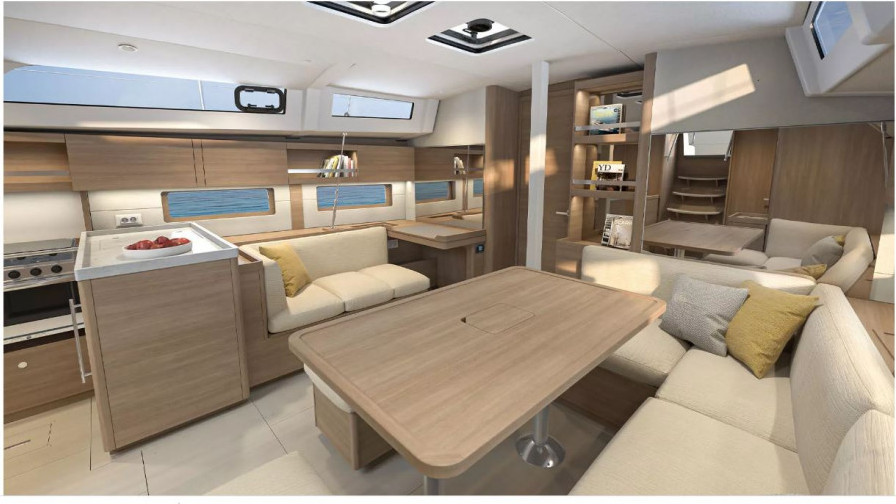 Gli interni sono di stile, luminosi e silenziosi grazie alla grande attenzione posta dai progettisti sull'isolamento acustico. Il cuore della barca è l'ampio salone con cucina a C, frigorifero a colonna (fino a 450 litri) e finiture in rovere sabbiato. La cabina armatoriale di prua ha un letto da 160 cm, grande stivaggio, illuminazione naturale e dettagli curati come testiere imbottite e luci LED soft.