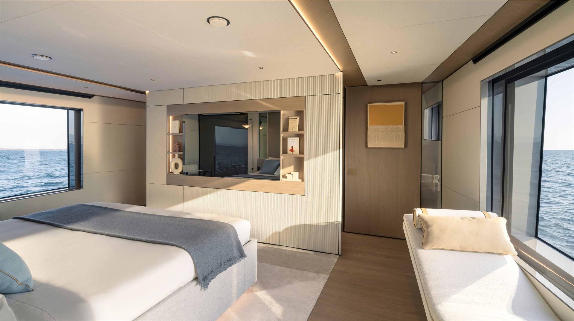 In tutto lo yacht, l’espressione creativa di m2atelier si rivela in una coreografia di geometrie sovrapposte e prospettive mutevoli, dando vita a una “architettura caleidoscopica”. Dal meticoloso allineamento delle venature del legno, al gioco architettonico di luci e ombre, ogni elemento contribuisce a creare uno spazio ampio e curato, dinamico ma allo stesso tempo perfettamente composto. Con un solo sguardo si può facilmente leggere tutto lo yacht: dal salone principale alla suite armatoriale fino al mare, in un’esperienza di apertura che non sacrifica mai l’intimità. La stessa Owner Suite diventa un gioco di trasparenze sovrapposte, in cui vetro e partizioni verticali ampliano lo spazio inondandolo di luce naturale.