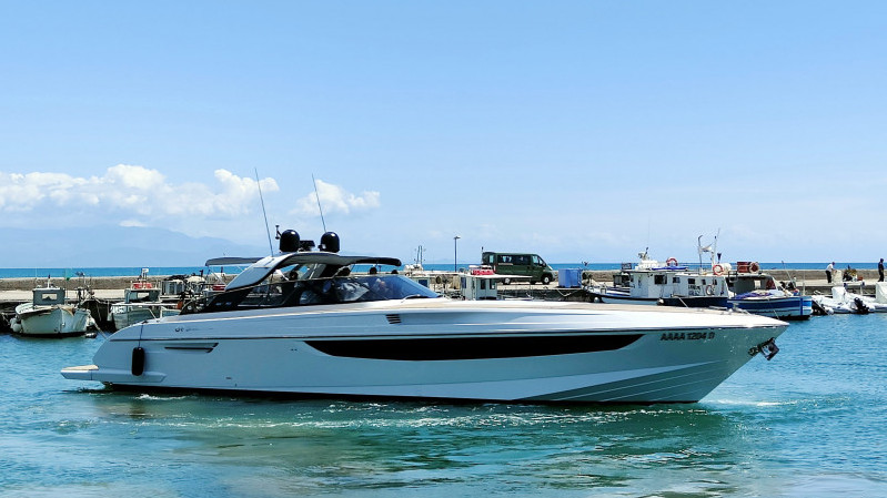 Gli interni sono personalizzati sul gusto del suo armatore con il layout, su questo modello, a 3 cabine. Abili artigiani hanno “curato” le rifiniture interne come fosse un abito sartoriale. Sul ponte di coperta questa versione prevede il roll-bar con doppio tendalino, verso prua e a poppavia per proteggere il pozzetto. Sulla plancia poppiera è posizionato il tender-lift.