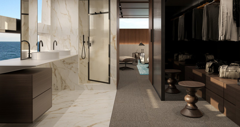 Rivestimenti in legno scuro, soffitti a cassettoni con finiture effetto resina, parquet a spina di pesce e materiali effetto pietra definiscono l'atmosfera raffinata degli interni dello yacht. Il bagno dell'armatore è rifinito con un lussuoso marmo Calacatta.