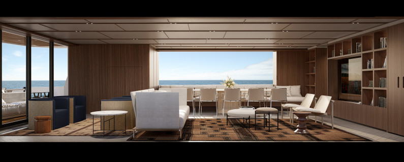 È questa fusione con l'ambiente esterno che migliora l'esperienza dell'armatore e dei suoi ospiti, consentendo un ampio respiro in un'interazione tra gli interni e il mare. Ad esplicitare questa caratteristica è la soluzione pensata quando la barca è all'ancora: sul lato di dritta è infatti possibile abbattere il parapetto e aprire così una terrazza sul mare. Lo stesso effetto è ricreato dalla murata che scorre verso il basso, allargando la finestra sottostante per consentire agli ospiti di godere appieno dell'ambiente esterno, in una comunione con il mare.