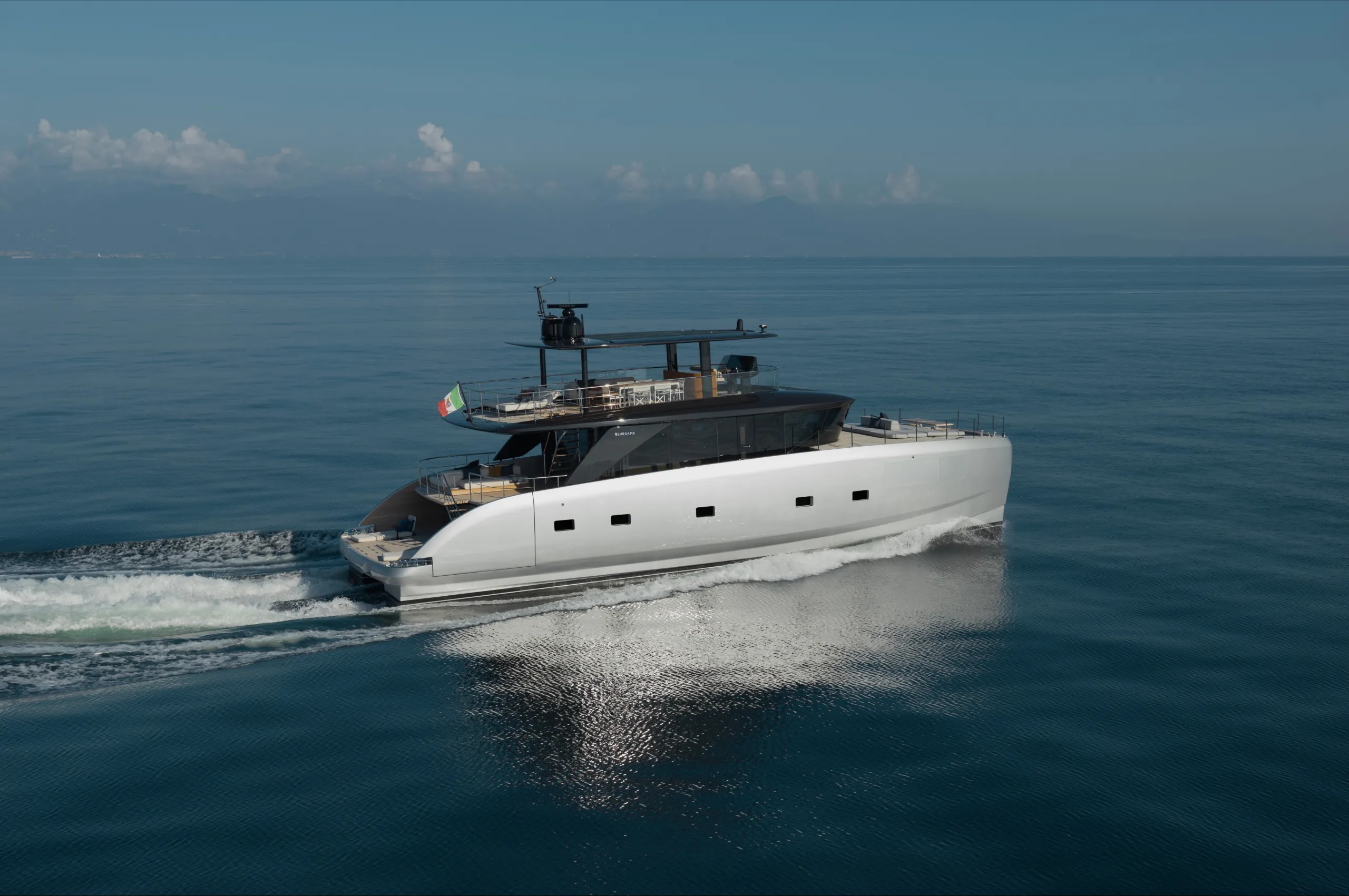 Progettato da Luca Santella, il BGM75 è un multiscafi di 75 piedi che coniuga stabilità, efficienza e comfort, mantenendo le proporzioni e il linguaggio stilistico del gruppo Sanlorenzo.