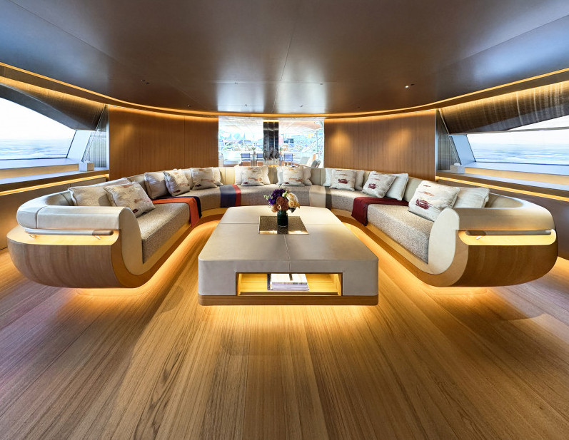 Elemento centrale dello yacht è la scala principale, concepita come fulcro distributivo degli interni. Strutture leggere, corrimani metallici e gradini sospesi si accostano alle essenze lignee, mentre stipiti e dettagli in alluminio verniciato introducono un accento contemporaneo. Il salone principale si presenta come uno spazio continuo e avvolgente, articolato da sedute curve, arredi integrati e geometrie morbide. Rivestimenti in pelle, porte scorrevoli in vetro satinato con trama metallica e il soffitto in foglia di palladio, arricchito da inserti lignei, contribuiscono a creare un ambiente equilibrato.