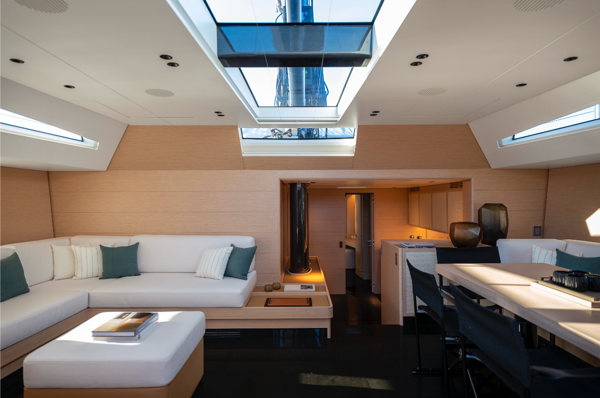A bilanciare lo scafo c’è un potente piano velico sloop. L’albero in carbonio ad alto modulo, realizzato da Hall Spars, è sostenuto da sartie ECSix in trefoli di carbonio. Le superfici veliche garantiscono velocità esaltanti di bolina, con 660 metri quadrati complessivi tra randa e fiocco – entrambi in 3Di di North Sails. In andatura portante, la vela dispiegata raggiunge i 1.283 metri quadrati.