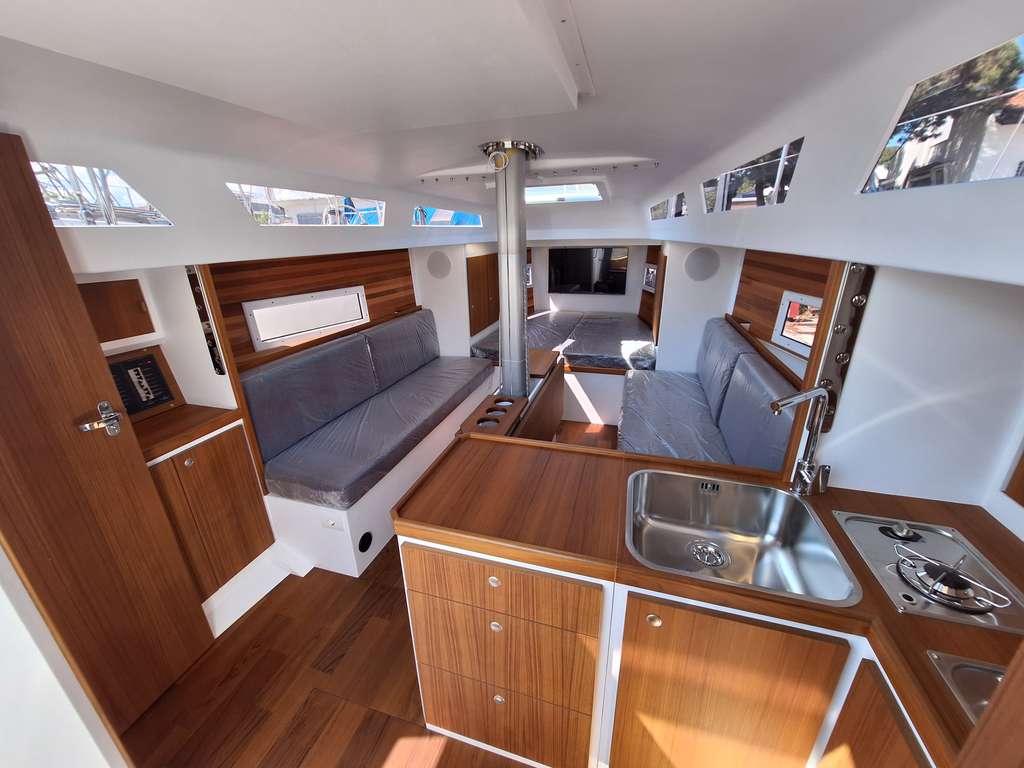 Il pozzetto, ampio e ben studiato per favorire la vita all’aperto, oltre ad integrare un capiente frigo e un lavandino nella consolle centrale, ospita delle sedute trasformabili in prendisole, grazie a innovativi schienali ribaltabili. Gli interni, pensati per offrire continuità visiva e ampiezza, si sviluppano in un unico grande openspace, con ambienti chiusi limitati alla cabina ospiti e al bagno, entrambi collocati a poppa.