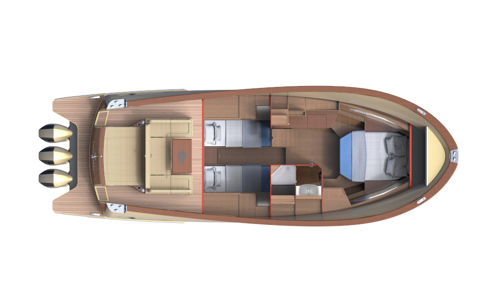 Il design interno è stato ulteriormente raffinato con finiture in legni pregiati e tessuti per la nautica selezionati. Esternamente si riconferma la poppa in mogano lucidato, tratto distintivo dell’identità costruttiva del cantiere.