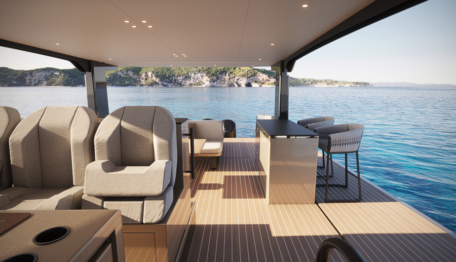FM - Ci saranno due versioni. La Lounge Deck con motorizzazione IPS, che garantisce ottime prestazioni e una spiaggetta di poppa più ampia grazie allo specchio arretrato. E la Gran Turismo con motorizzazione fuoribordo: crediamo molto negli outboard, che danno praticità e libertà di layout. Oggi l’interesse che vediamo è circa 60/40 a favore dei fuoribordo.