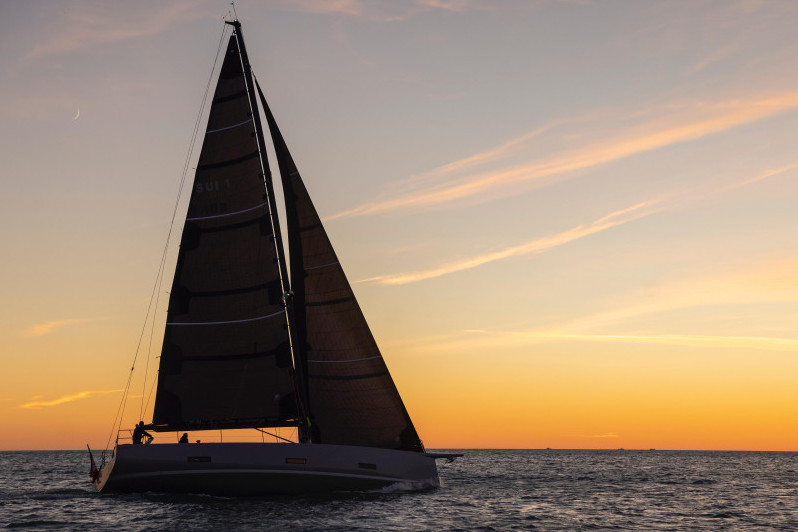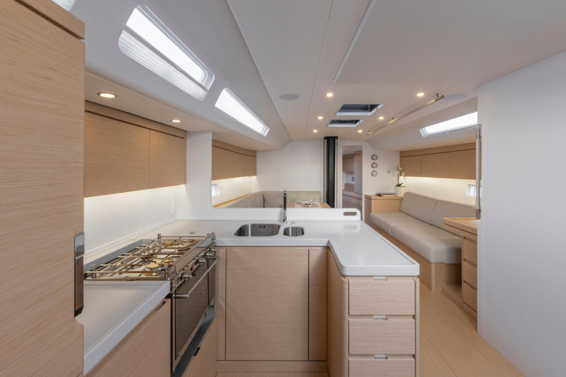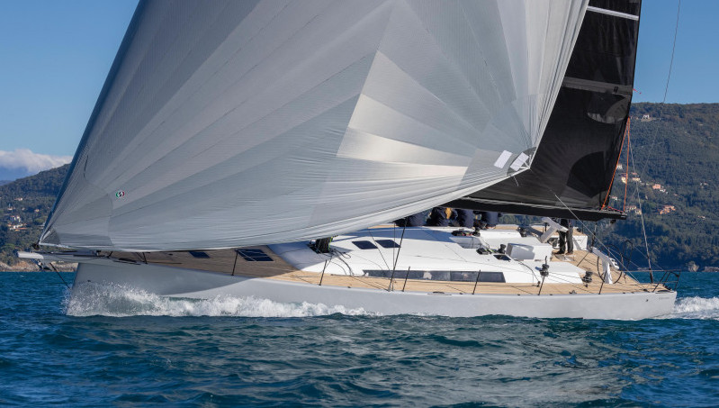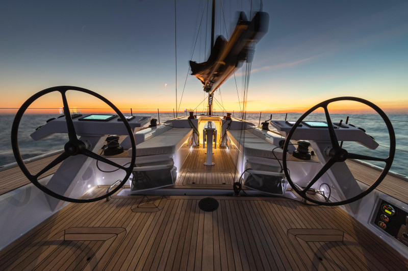 Il piano velico si caratterizza per un genoa a bassa sovrapposizione, assenza di volanti e sartie attestate direttamente sullo scafo. La barca beneficia così del comfort dei 60 piedi di qualche anno fa e della rapidità di manovra di un 50 piedi moderno.