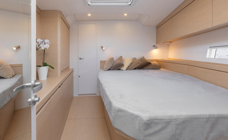 Uno dei punti centrali dell’ICE 54 SUITE è l’abitabilità interna. La cabina armatoriale di prua può essere configurata con maxi letto centrale o, in alternativa, con bagno dedicato. La cucina presenta una soluzione con isola e un maxifrigo di tipo domestico, mentre le cabine di poppa beneficiano di un bagno extra-large dotato di box doccia separato. L’aria condizionata è di serie.