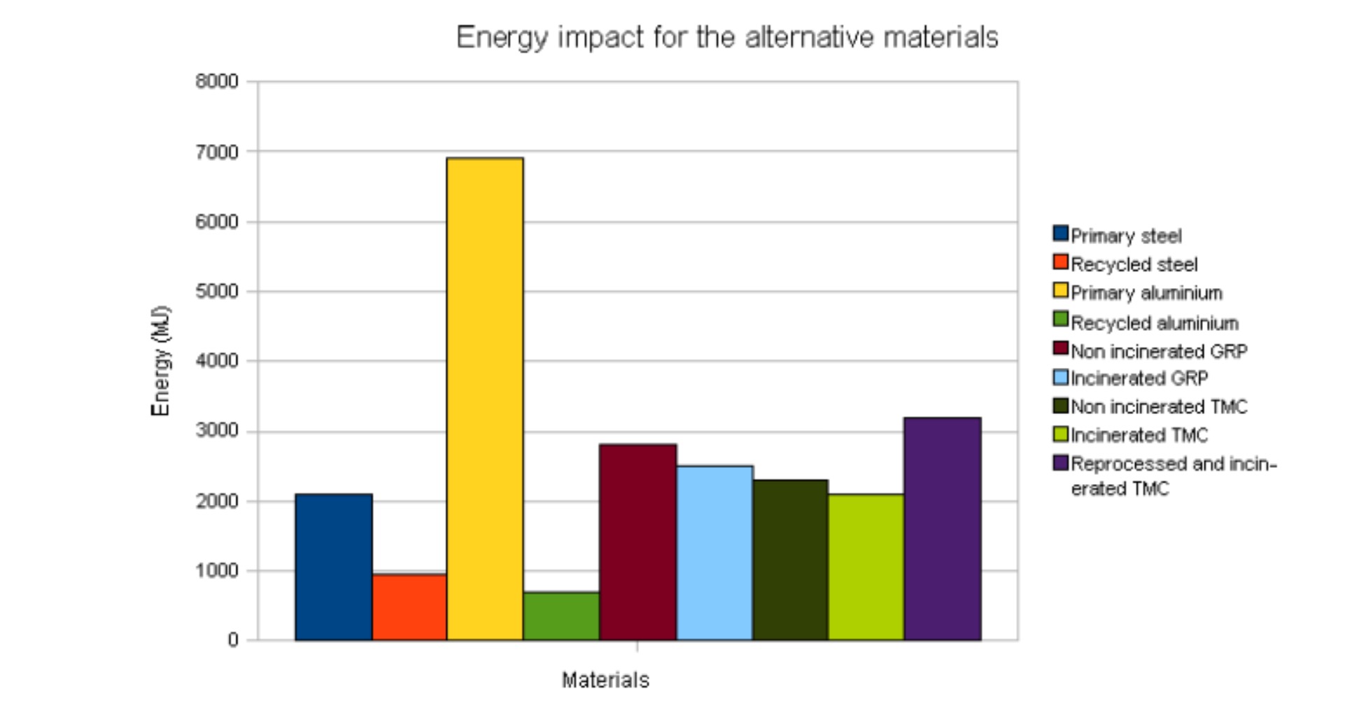 - si trascurano le emissioni in fase di utilizzo perché sono le stesse in entrambi i casi, tutto vetroresina e parziale vetroresina + alluminio, e non intervengono nel differenziale tra le due soluzioni