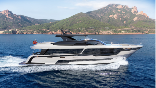 Il progetto si inserisce nell’evoluzione stilistica delle recenti interpretazioni raised pilothouse del cantiere, con linee tese, proporzioni dinamiche e un’impostazione funzionale orientata alla vita a bordo prolungata.
