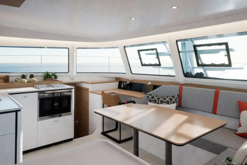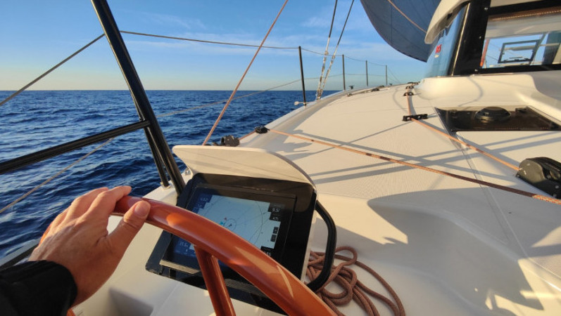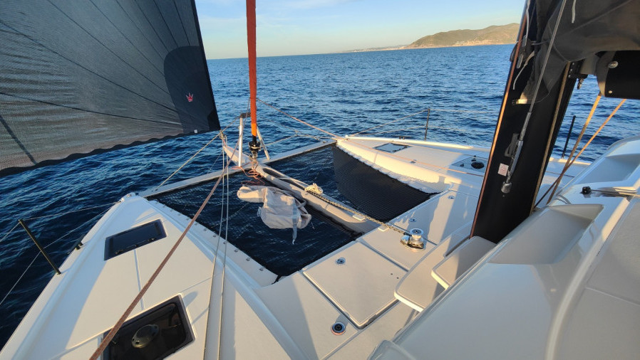 Le sensazioni al timone sono familiari: è diretto, posizionato molto vicino all’acqua, all’estrema poppa, e restituisce un feeling che ricorda quello di una barca monoscafo, pur con un comportamento ovviamente diverso. Gli scafi hanno un profilo asimmetrico tra parte interna ed esterna e, su questo 13 metri, si è lavorato anche per ridurre la superficie bagnata. Il risultato sono virate più agili rispetto a un catamarano tradizionale, possibili anche con pochissimo vento.