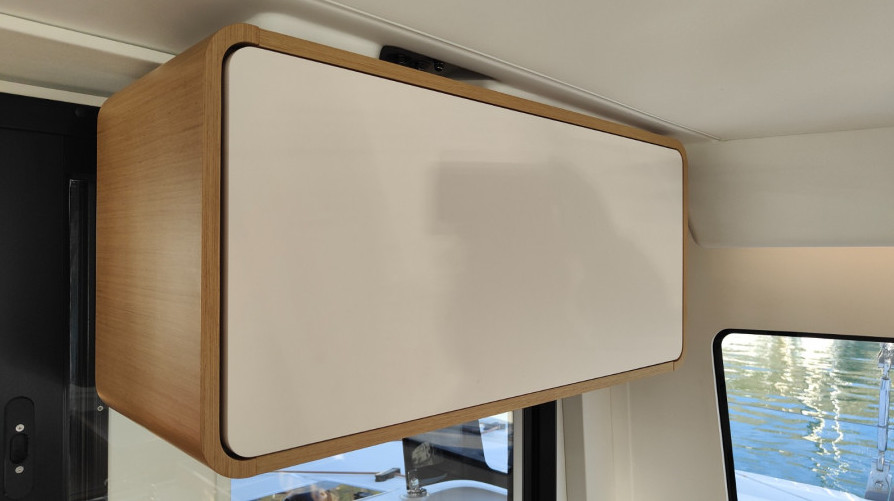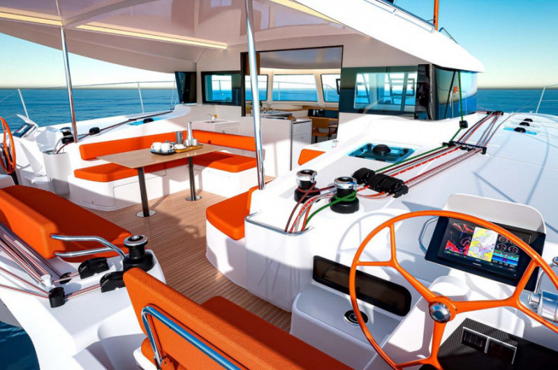 All’esterno si apprezza l’attenzione all’ergonomia del piano di coperta, sia per le manovre sia per il comfort degli ospiti. La versione Performance dispone di un albero maggiorato di un metro, timoni arancioni a contrasto e solidi tientibene in tubolare nero opaco che supportano i tettucci sopra le due timonerie, ciascuna con una superficie di circa 2 mq. Soluzioni forse un po’ impattanti dal punto di vista estetico, ma comunque attentamente studiate ed efficaci nella protezione dal sole e dalla pioggia.