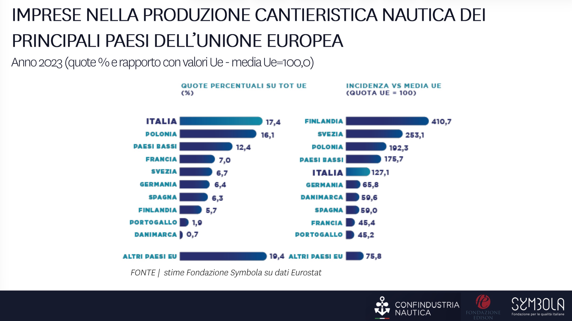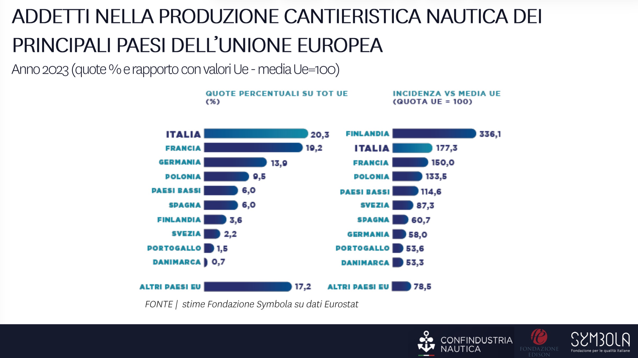 Anche sul fronte occupazionale l’Italia mantiene il primato europeo. Secondo i dati illustrati da Sturabotti, un addetto nautico europeo su cinque è italiano. Alle spalle dell’Italia si colloca la Francia, seguita da Germania e Polonia.