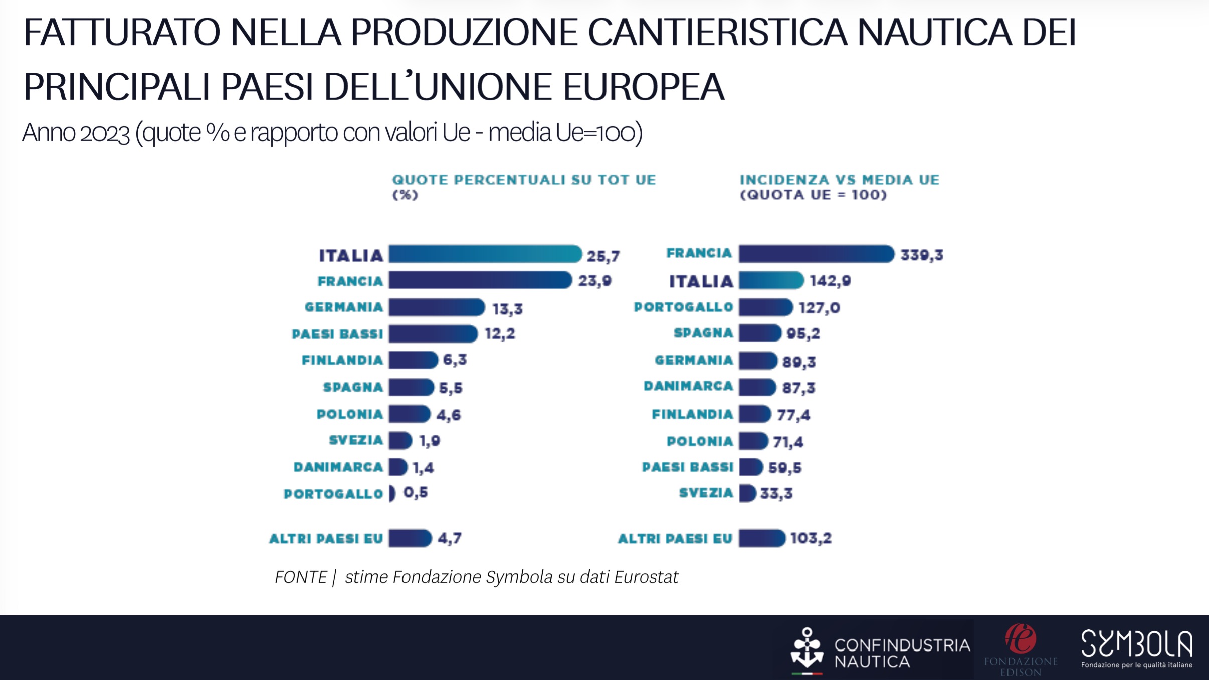 Il primato si conferma anche sul piano del fatturato: circa un quarto del giro d’affari complessivo della nautica europea è generato in Italia. Seguono, anche in questo caso, Francia, Germania e Paesi Bassi.