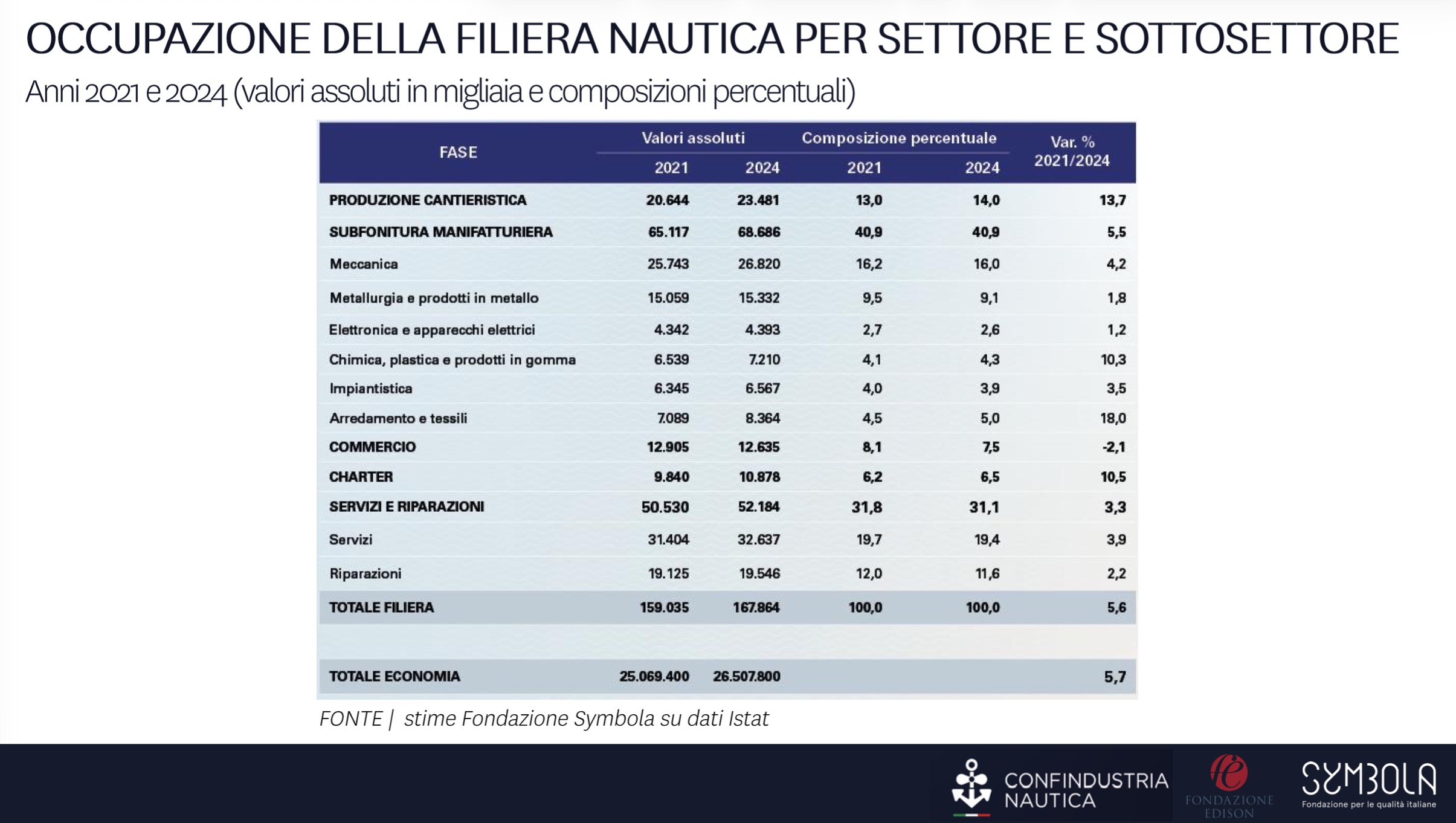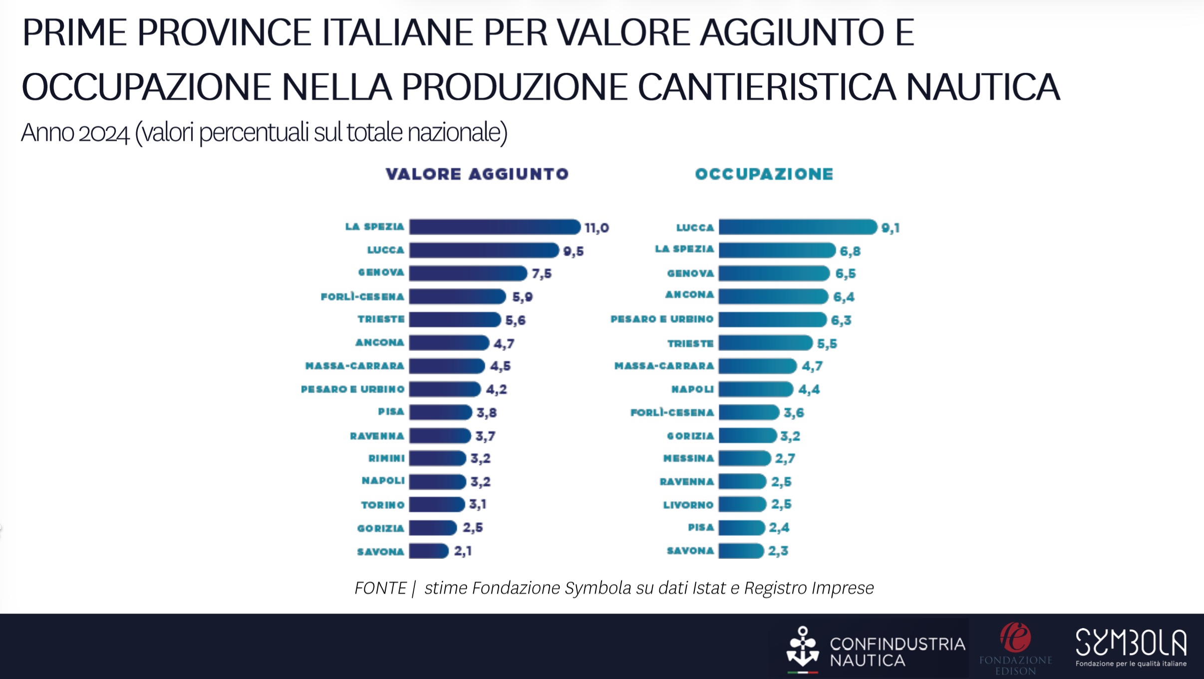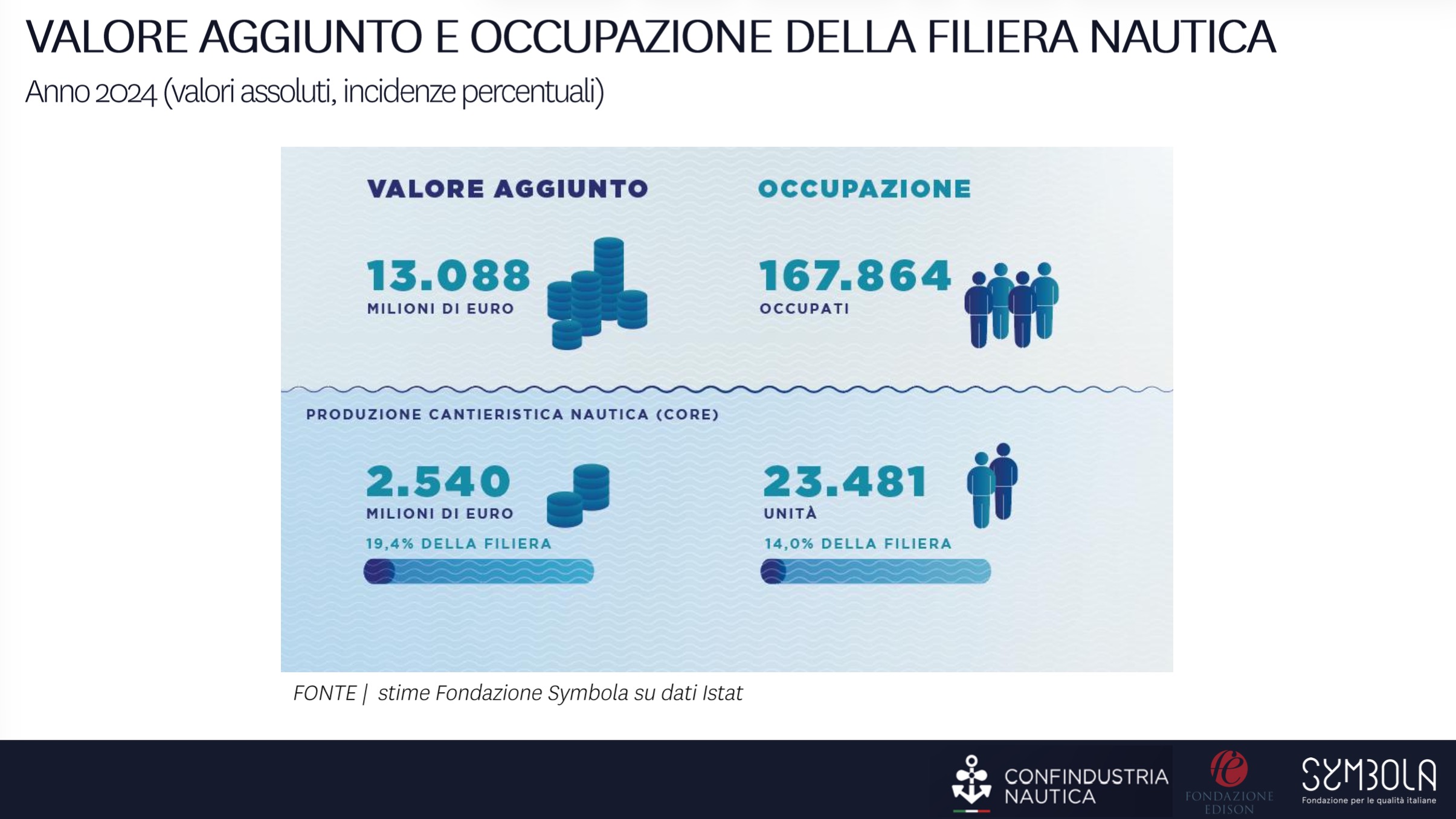 Scendendo alla dimensione nazionale, il report evidenzia come nel 2024 la sola produzione cantieristica abbia generato un valore aggiunto pari a 2,5 miliardi di euro e impiegato 23.000 addetti. Se però si considera l’intera filiera, il quadro si amplia fino a 13 miliardi di euro di valore aggiunto e 160.000 addetti.