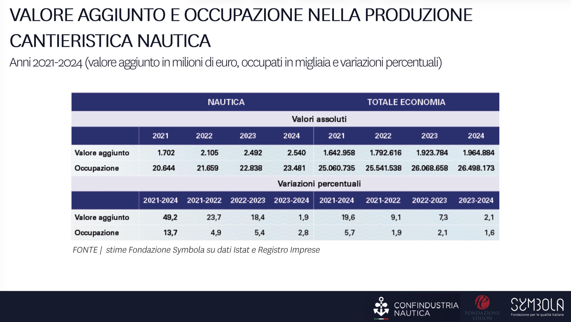 Uno dei passaggi centrali dell’analisi riguarda la crescita registrata dalla dimensione cantieristica nel lungo periodo. Dal 2021 al 2024 il valore aggiunto della cantieristica passa da 1,7 miliardi a 2,5 miliardi di euro, con un incremento del 49%. Un tasso di crescita che, secondo quanto sottolineato da Sturabotti, risulta pari a circa due volte e mezzo quello medio registrato nel complesso dell’economia nazionale.