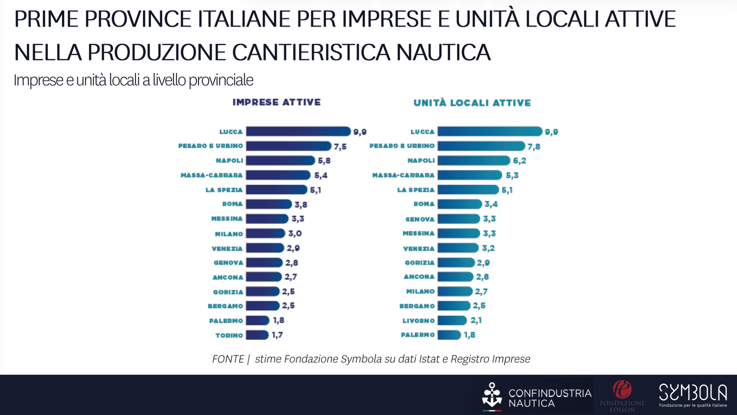 L’analisi provinciale consente però di distinguere tra due diverse geografie: quella amministrativa, basata sul numero di imprese attive, e quella produttiva, legata alle unità locali e quindi agli stabilimenti. Nella classifica provinciale per imprese attive, la prima posizione spetta a Lucca, trainata dal distretto di Viareggio. Seguono Pesaro e Urbino, Napoli e Massa-Carrara.