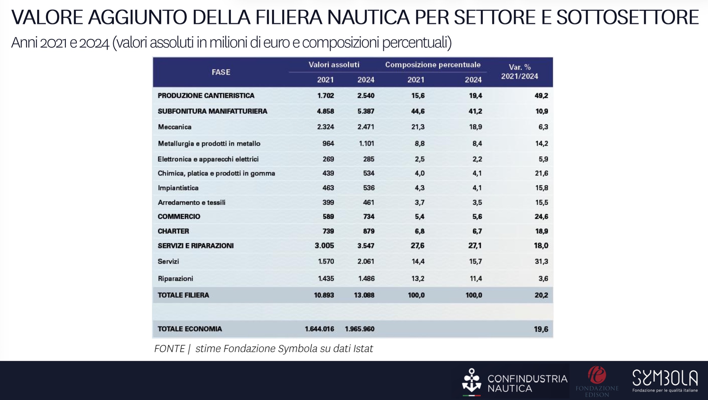 Questo andamento ha modificato anche il peso relativo della cantieristica all’interno della filiera complessiva. Se nel 2021 essa rappresentava il 15,6% del valore della filiera, nel 2024 la quota sale al 19,4%. Secondo Sturabotti, questo aumento riflette sia l’incremento degli investimenti destinati a elevare la qualità dei prodotti, sia un processo di internalizzazione di funzioni che concentra sempre più valore nel cuore industriale della filiera.