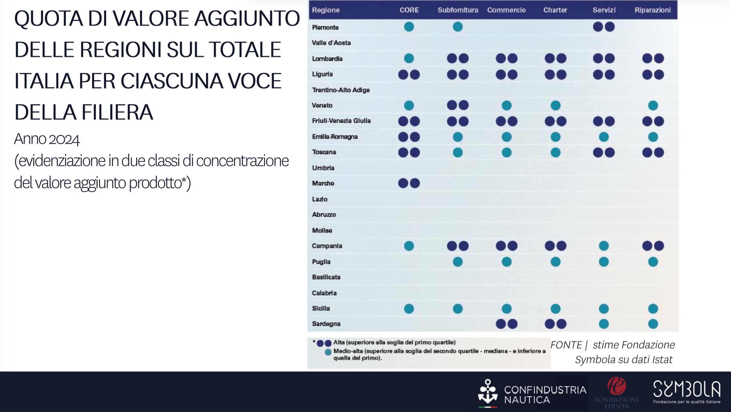 Nell’ultima parte della presentazione, il report ha messo a sistema la distribuzione territoriale della filiera. Se la produzione cantieristica mostra una concentrazione più marcata in alcuni territori — in particolare Liguria, Friuli Venezia Giulia, Emilia-Romagna, Toscana e Marche — l’allargamento dello sguardo all’intera filiera restituisce una geografia più estesa, che coinvolge l’intero Paese.