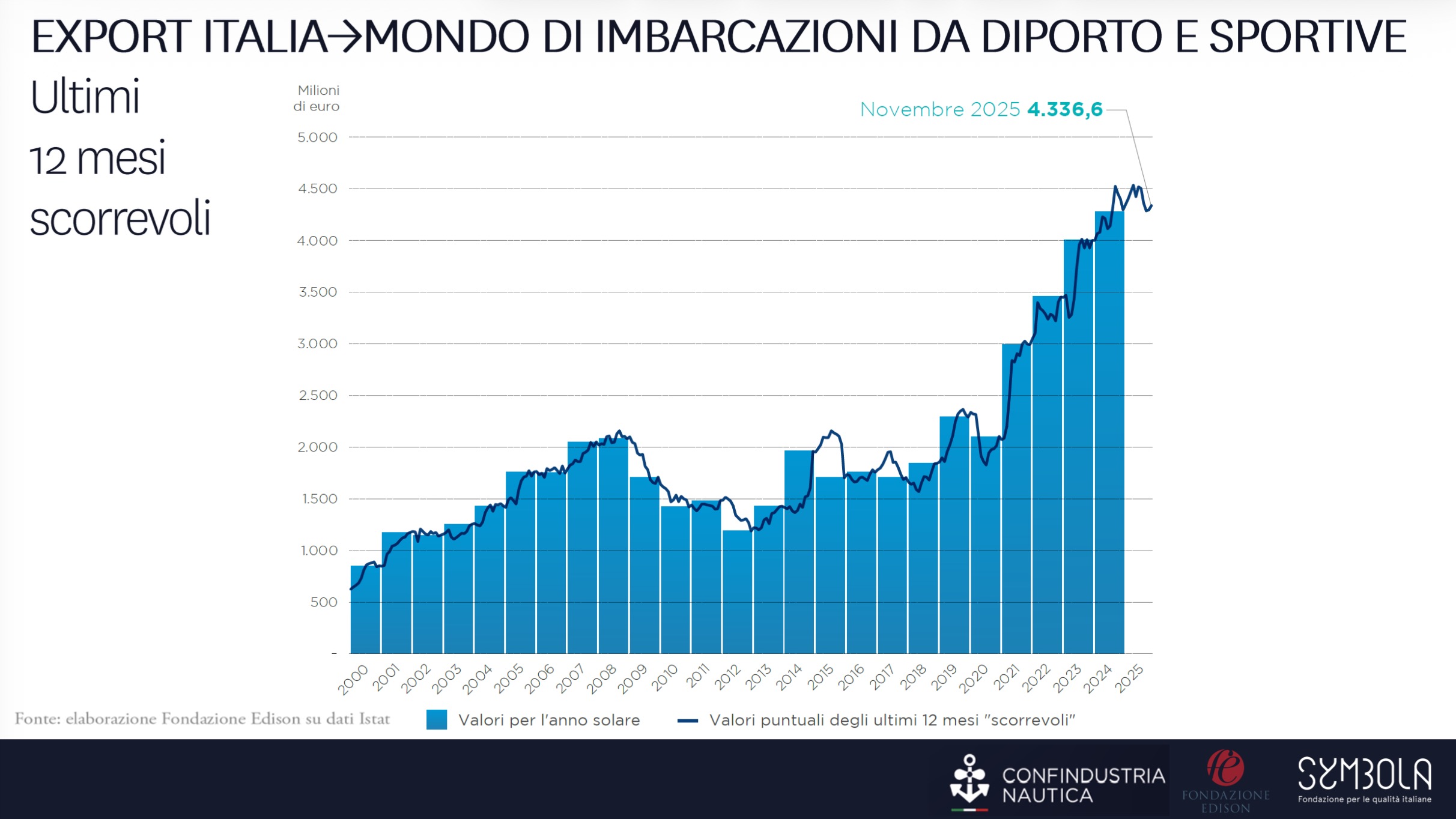 Pur non essendo ancora disponibili i dati definitivi sull’intero 2025, il valore delle esportazioni negli ultimi dodici mesi scorrevoli — da dicembre 2024 a novembre 2025 — ha raggiunto i 4,3 miliardi di euro.