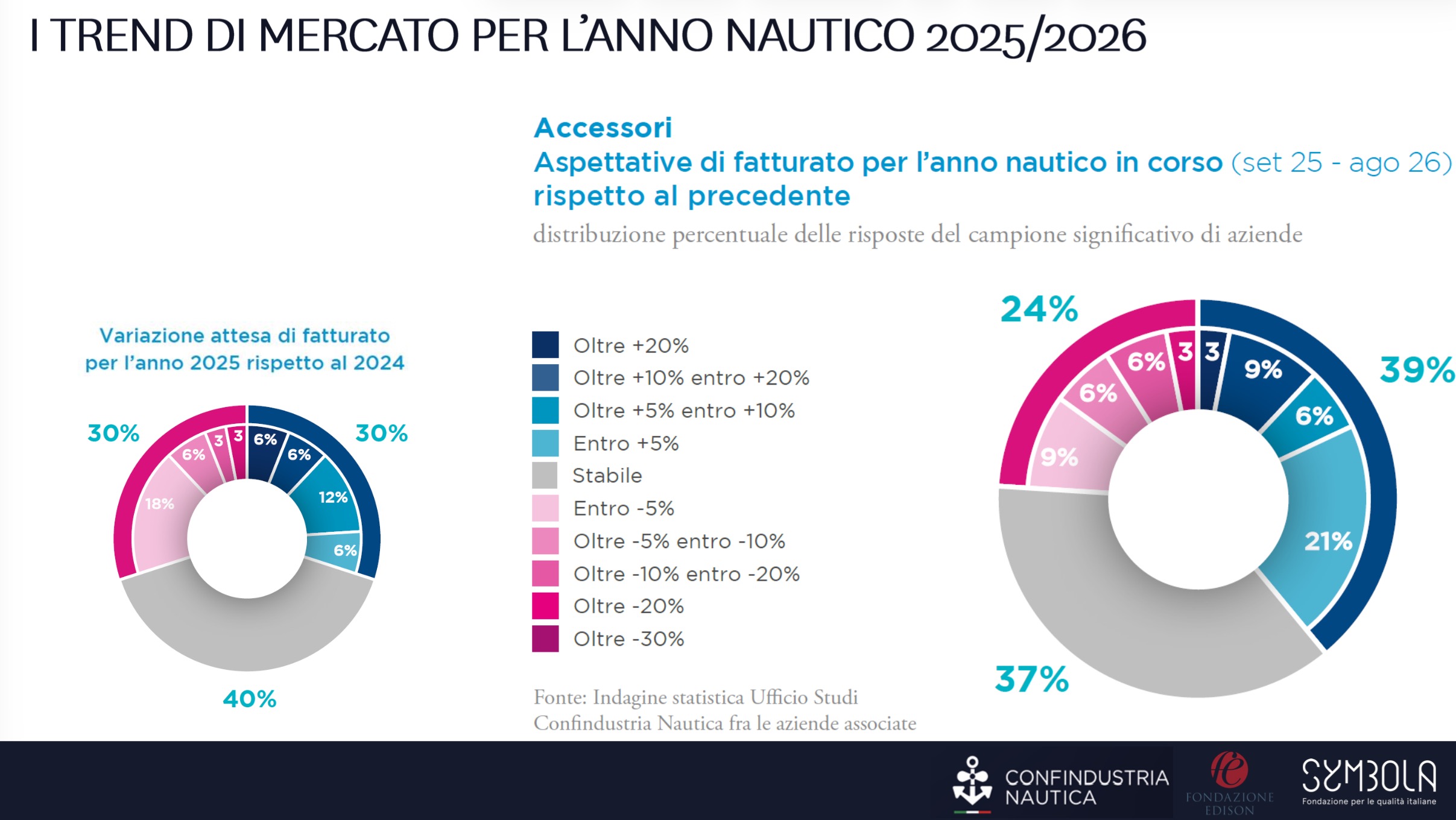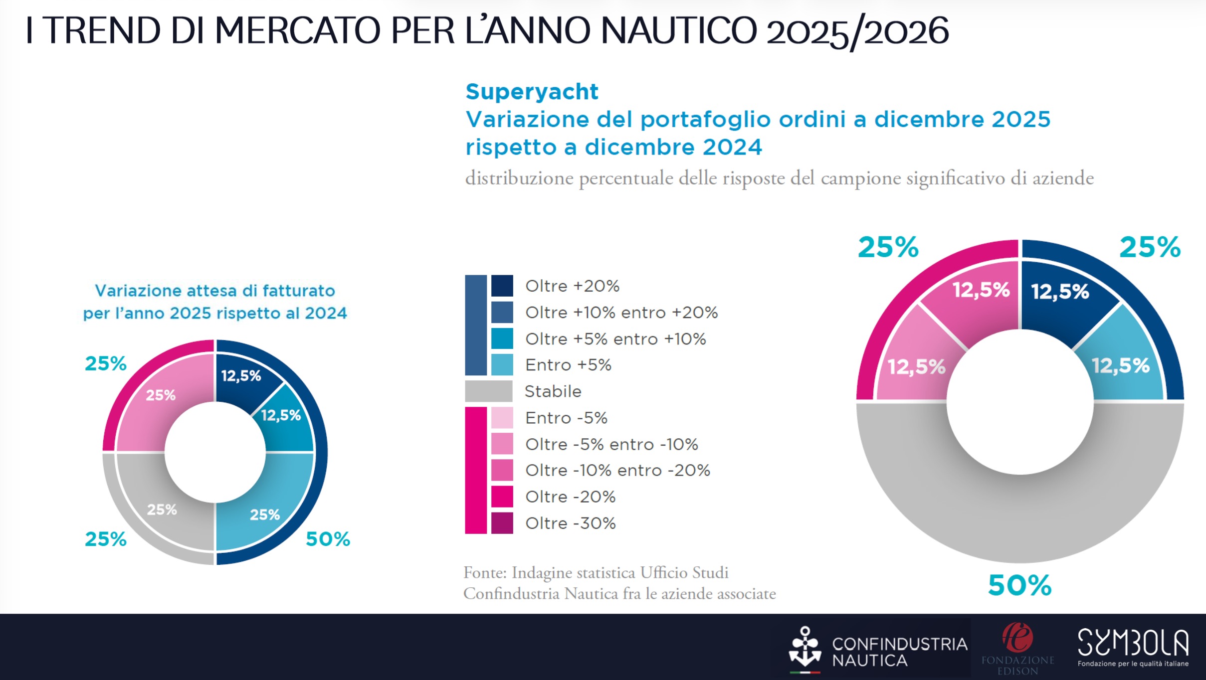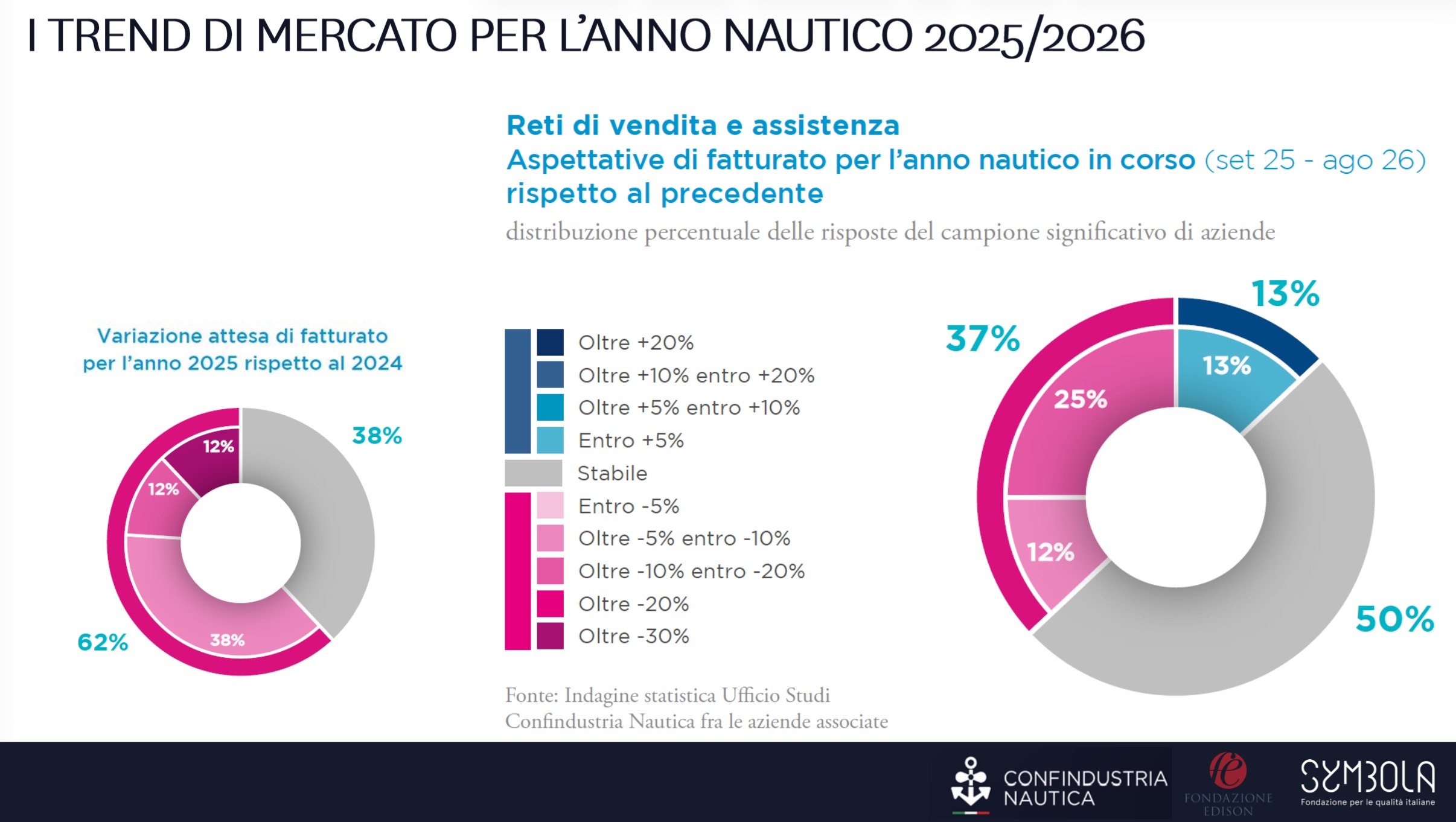 Una distribuzione simile emerge anche nel comparto dei motori marini, dove nel 2025 le imprese risultano equamente divise tra previsioni di crescita e riduzione del volume d’affari. Il sentiment per l’anno nautico in corso appare comunque più favorevole: la quota di aziende che stima un aumento del fatturato sale dal 25% al 38%.