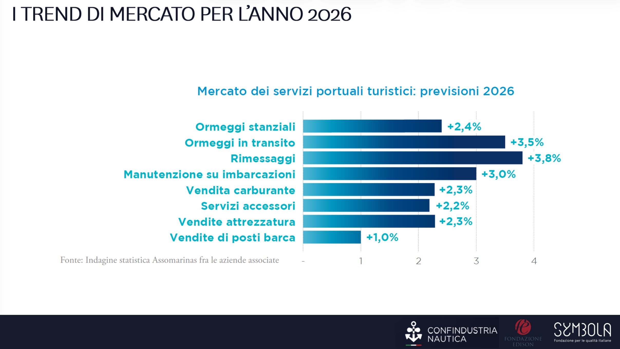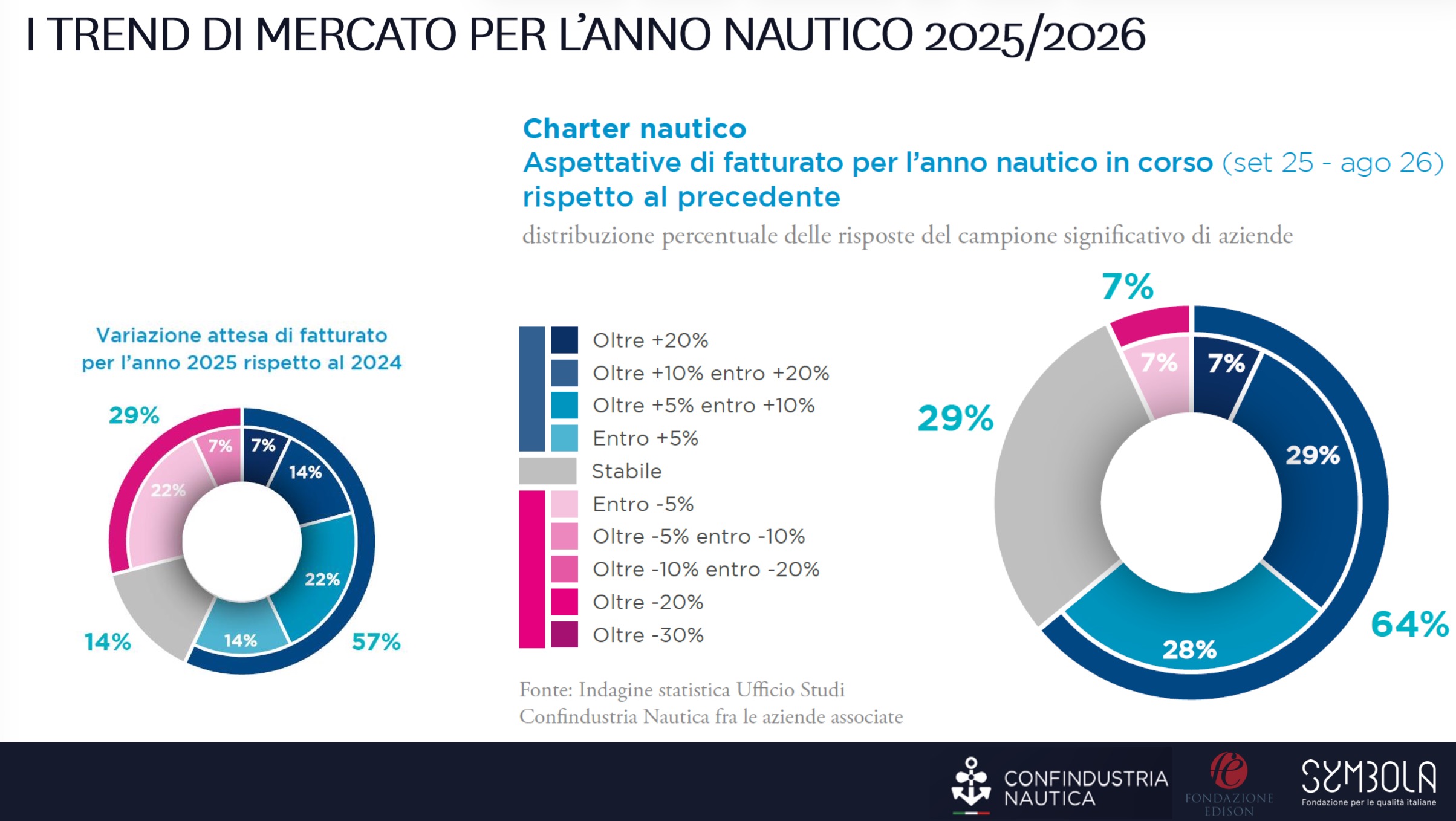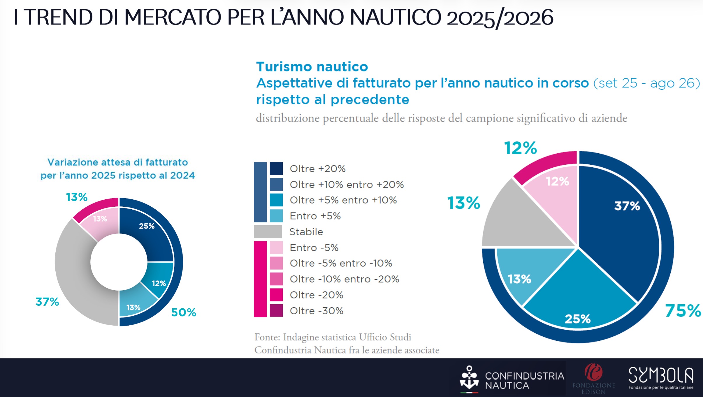 Una distribuzione simile emerge anche nel comparto dei motori marini, dove nel 2025 le imprese risultano equamente divise tra previsioni di crescita e riduzione del volume d’affari. Il sentiment per l’anno nautico in corso appare comunque più favorevole: la quota di aziende che stima un aumento del fatturato sale dal 25% al 38%.