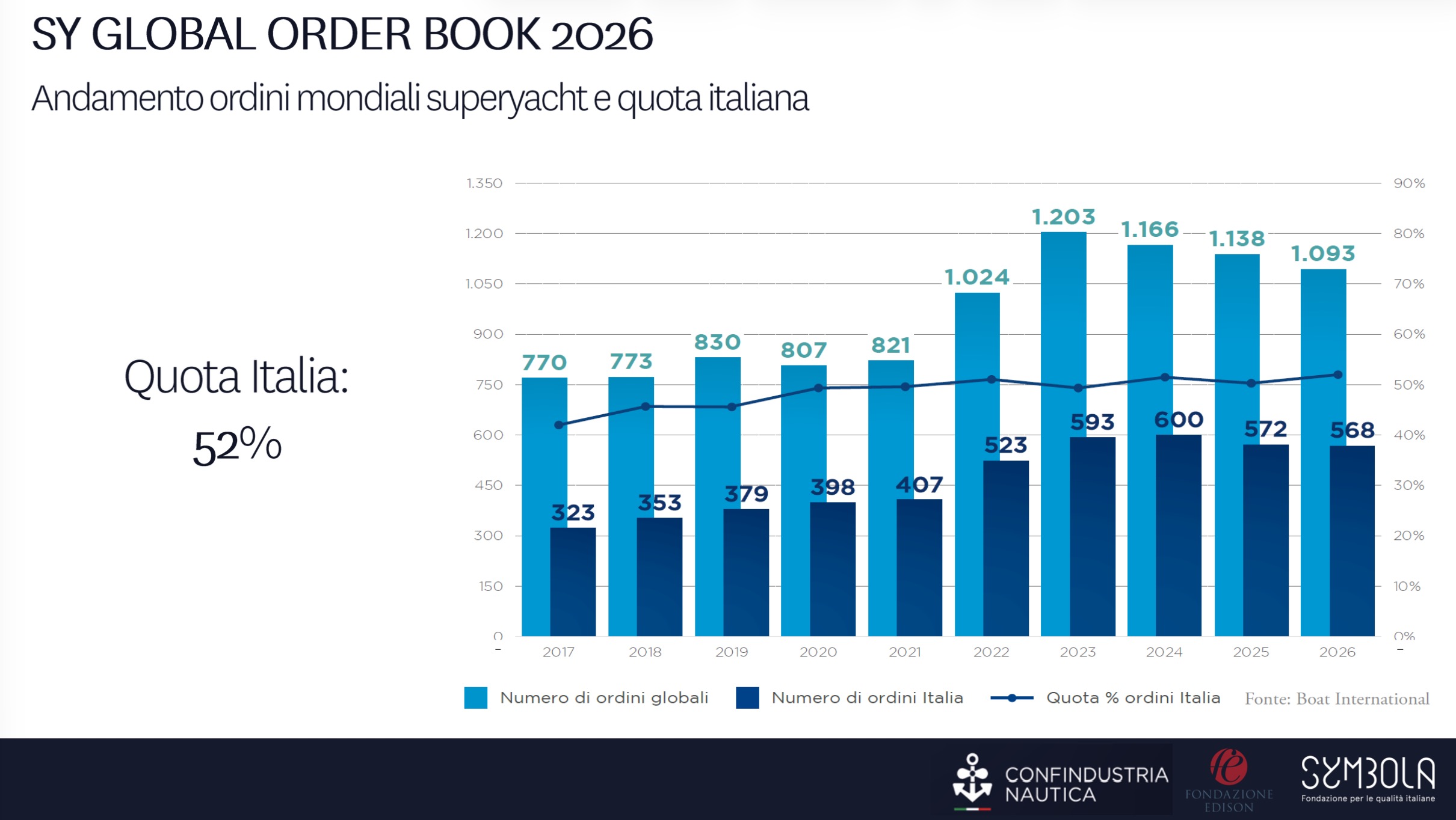 Il quadro è coerente con i dati del Global Order Book 2026 pubblicato da Boat International: a fronte di una riduzione complessiva degli ordini mondiali di circa il 4%, da 1.138 a 1.093 unità, la quota italiana cresce di due punti percentuali, raggiungendo il 52% del totale e mantenendo sostanzialmente stabile il numero di unità ordinate, pari a 568 all’inizio dell’anno.